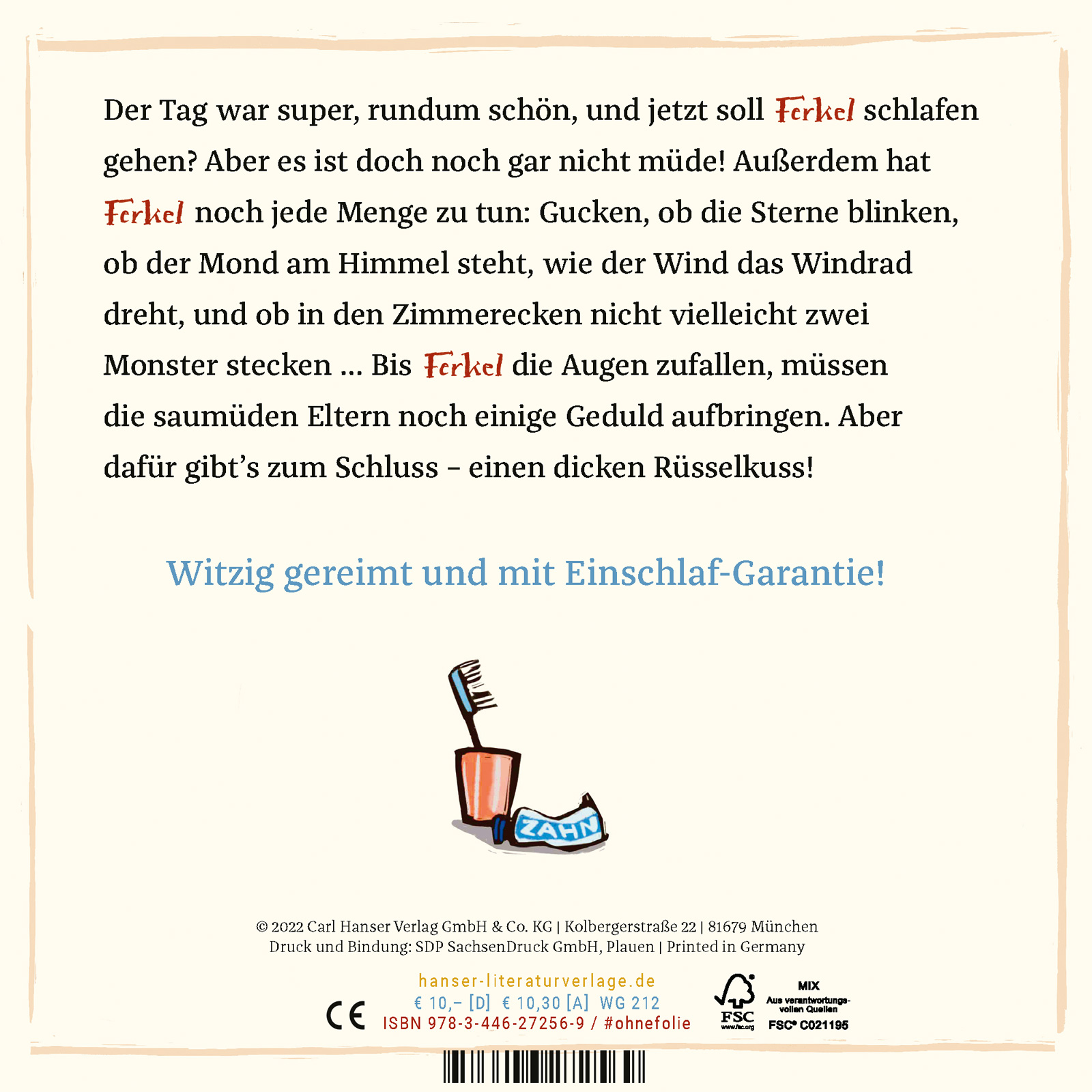 Der Tag war super, rundum schön, jetzt soll das Ferkel schlafen gehen? Aber es ist doch noch gar nicht müde! Also erst mal Zähne putzen, Borstenkamm und Schwamm benutzen. Nachschauen, ob die Sterne blinken, in die Küche, noch was trinken. Ob der Mond am Himmel steht und der Wind das Windrad dreht? Sind Monster in der Zimmerecke oder unter Ferkels Decke? Wo ist Kuschelhase Hopp? Papa sucht ihn im Schweinsgalopp. Dann ist aber Lesezeit! Mama steht auch schon bereit. Doch bis Ferkel die Augen tatsächlich zufallen, müssen die saumüden Ferkeleltern noch einige Geduld aufbringen. Dafür gibt's zum guten Schluss - einen dicken Rüsselkuss!