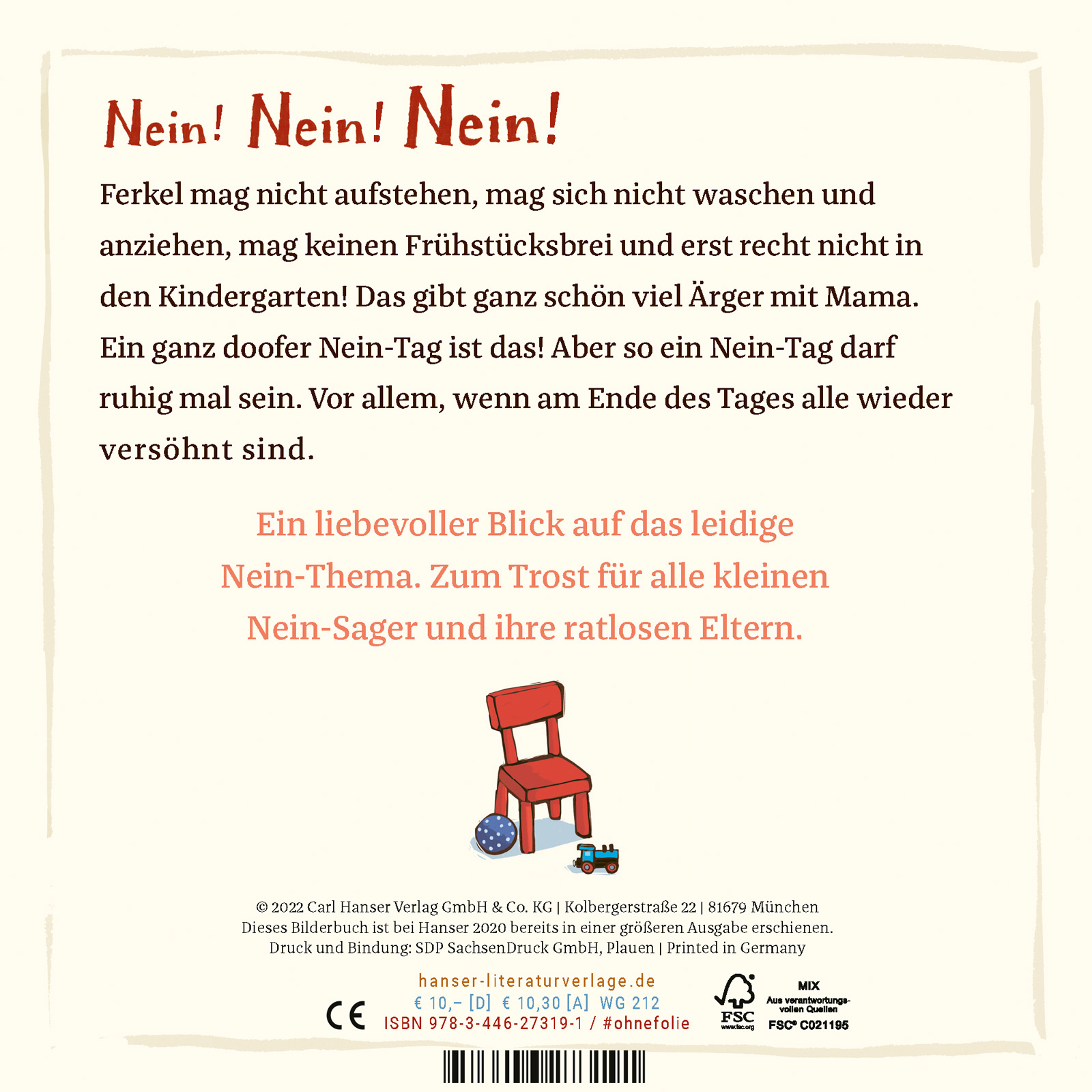 Endlich: Das kleine Nein-Schwein jetzt auch als Pappe! Nein, Ferkel mag nicht aufstehen. Im Bett ist es so kuschelig und warm. Aber das Ferkel soll aufstehen. Sagt jedenfalls Mama. Und sich anziehen. Und seinen Frühstücksbrei essen. Und die Zähne putzen. Aber Ferkel mag nicht, ganz und gar nicht. Nein! Nein! Nein! Da kann Mama sagen, was sie will, und schimpfen, so viel sie will. Aber Mama sagt gar nichts mehr, sondern packt Ferkel einfach so aufs Rad. Ohne Jacke und Gummistiefel. Viel zu spät kommen sie beim Kindergarten an. Und dann ist Mama weg, ganz schnell. Ferkel knurrt der Magen, und kalt ist ihm auch. Ein ganz doofer Nein-Tag ist das! Ob Mama bald wiederkommt? Ja, da ist sie und schließt Ferkel endlich in ihre Arme!