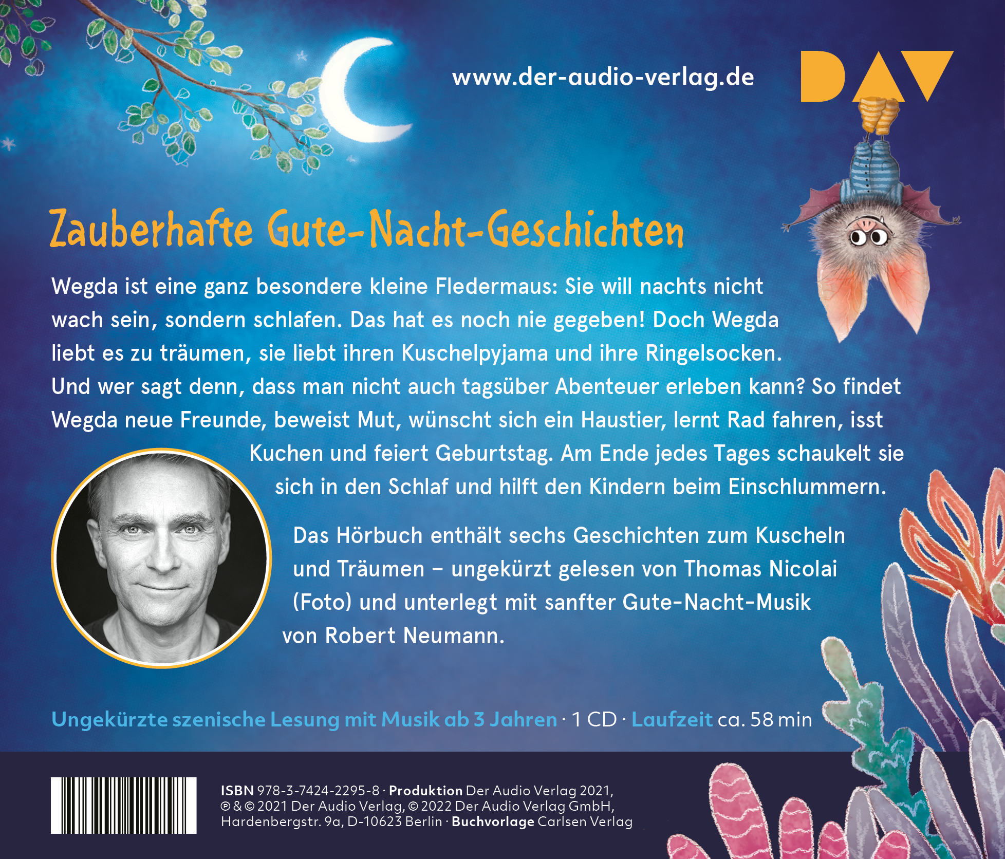 Die kleine Fledermaus Wegda ist so gar nicht fledermausig: Sie ist tollpatschig, hat riesige Füße und will nachts nicht wach sein! Das hat es bei Familie Fledermaus noch nie gegeben. Aber Wegda ist das egal. Sie liebt es zu träumen und tagsüber gibt es so viel mehr zu entdecken. In sechs Geschichten findet Wegda neue Freunde, beweist Mut, lernt Rad fahren, feiert Geburtstag und hat dabei jede Menge Spaß. Am Ende jedes Tages putzt sie ihre Eckzähne, zieht ihre Kuschelsocken an, schaukelt sich in den Schlaf und hilft kleinen Hörer:innen ab 3 Jahren beim Einschlummern.Ungekürzte szenische Lesung mit Thomas Nicolai1 CD | ca. 58 min