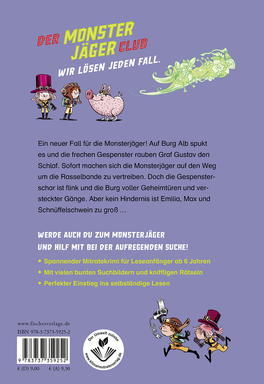 Dieser Fall hat es in sich! Auf Burg Alb treibt eine wilde Gespensterschar ihr Unwesen. Graf Gustav ist verzweifelt, er kann nicht mehr schlafen. Um Mitternacht zur Geisterstunde ist es am schlimmsten! Sofort machen sich die Monsterjäger auf den Weg um die freche Rasselbande zu vertreiben. Doch es wird knifflig, denn die Gespenster sind flink und die Burg ist voller Geheimtüren und versteckter Gänge. Aber kein Hindernis ist für Emilia, Max, Schnüffelschwein und Erfinder-Opa zu groß! Also los, lasst die Jagd beginnen ...