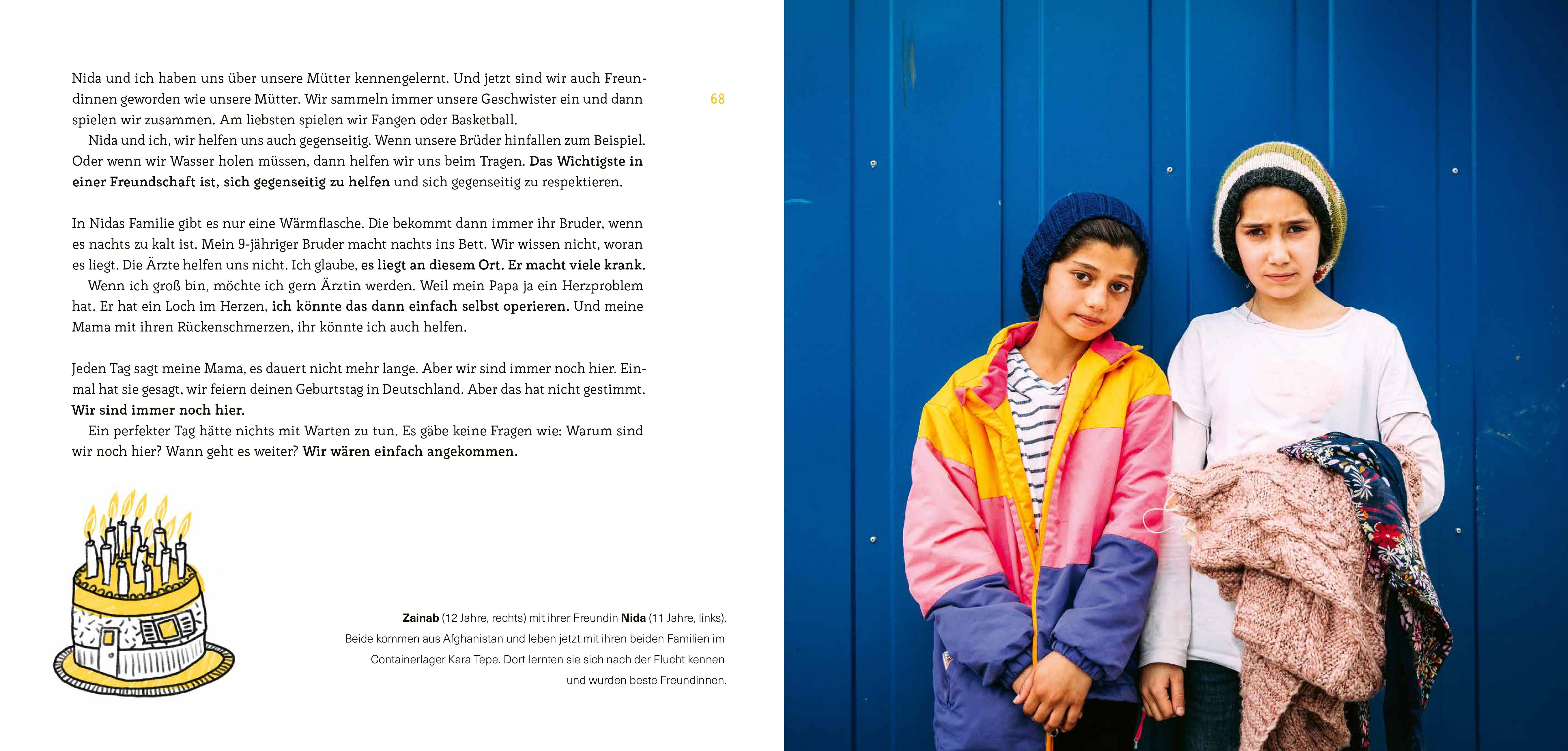 Die Fotografin und Nothelferin Alea Horst hat mit ihr und anderen Kindern gesprochen, hat sie nach ihrem Alltag im Lager gefragt, nach ihren Erlebnissen, Ängsten und Träumen, auch nach ihrem Lieblingswitz. Entstanden ist eine herzergreifende Sammlung aus Porträts, Momentaufnahmen und dramatischen, aber auch hoffnungsvollen Berichten. Die begnadete Fotografin gibt den Camp-Kindern mit diesem Buch Gesicht und Stimme. Der Illustrator Mehrdad Zaeri, selbst einst aus dem Iran geflüchtet, visualisiert die Sehnsüchte in stimmungsvollen Vignetten.