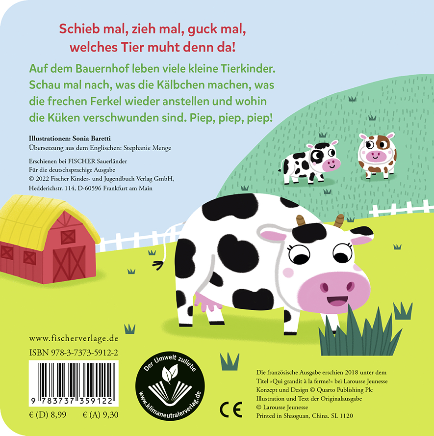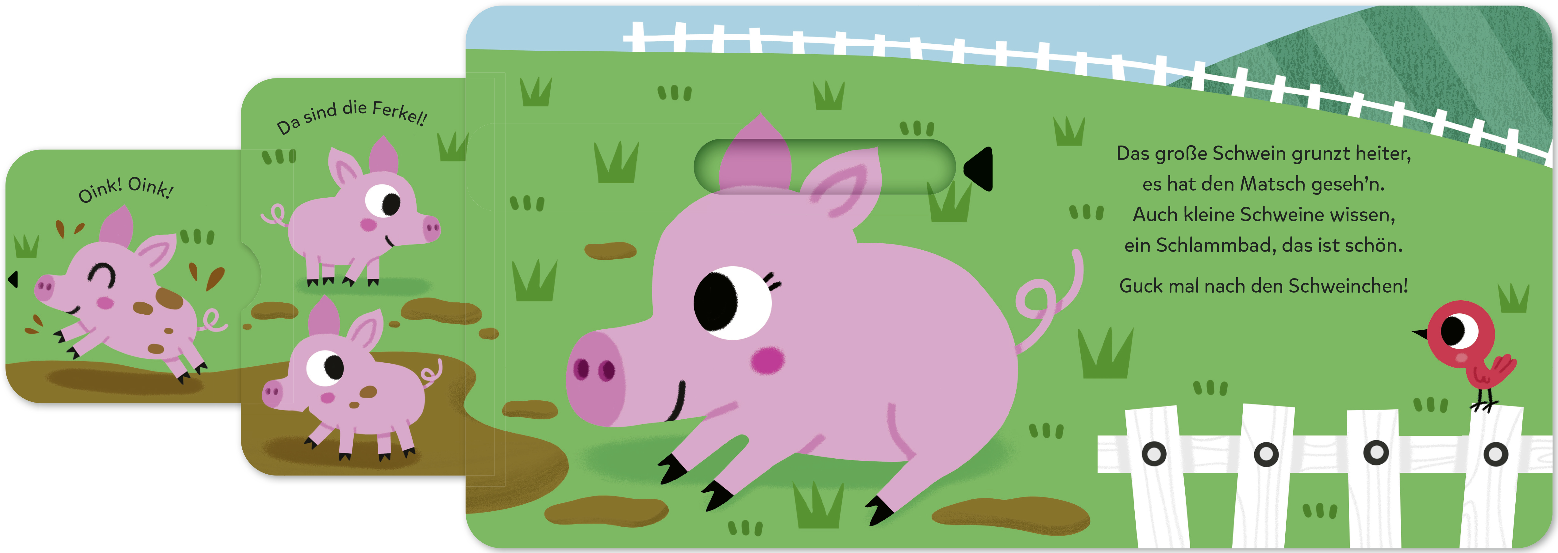 Muh muh, piep, piep! Auf dem Bauernhof leben viele Tierkinder. Mit den stabilen Schieb- und- Zieh-Elementen kann man freche Ferkel, wilde Fohlen und niedliche Küken entdecken. Kleine Reime fordern zum Raten und Entdecken auf. Ganz nebenbei lernen die Kinder die Tiernamen und Tierstimmen kennen. Sprechenlernen und die Fingerchen schulen geht so so herrlich spielerisch! Ein ganz besonderes Tier-Spielbuch für Kinder ab 18 Monaten.