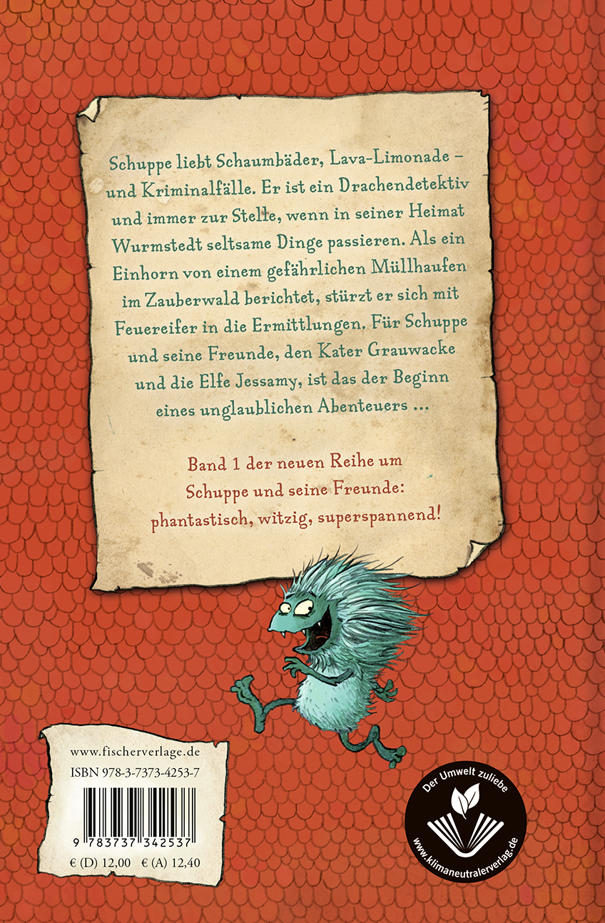 Schuppe liebt Schaumbäder, Lava-Limonade - und Kriminalfälle. Er ist ein Drachendetektiv und immer zur Stelle, wenn in seiner Heimat Wurmstedt seltsame Dinge passieren. Als ein weinendes Einhorn vor seiner Baumhöhle steht und von einem gefährlichen magischen Müllhaufen berichtet, lässt Schuppe sich nicht lange bitten. Zusammen mit seinen Freunden, dem coolen Kater Grauwacke und der kämpferischen Elfe Jessamy stürzt er sich mit echtem Feuereife in die Ermittlungen. In den Tiefen des Zauberwaldes erwartet die drei ein unglaubliches Abenteuer ...