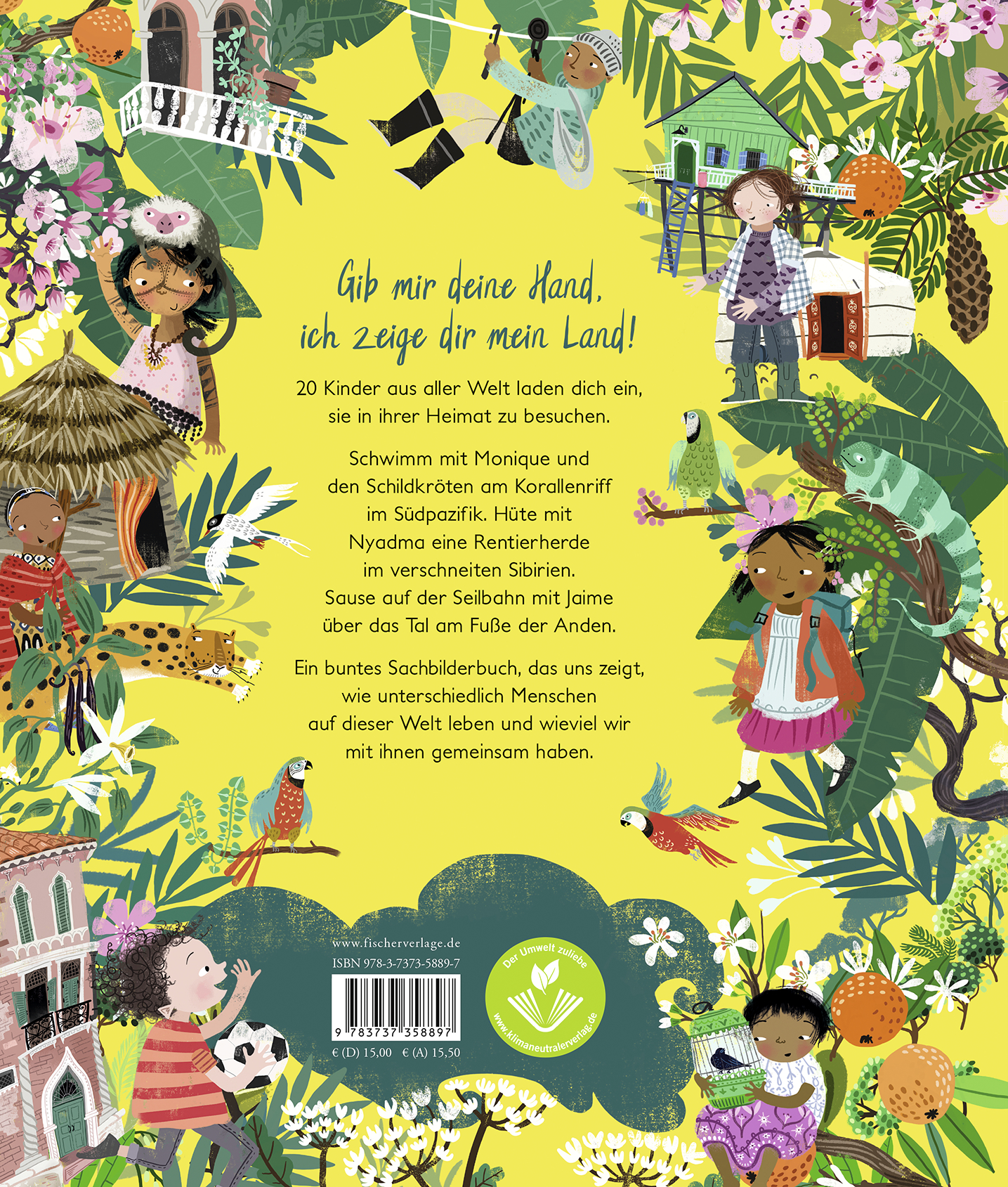 lt;p>20 Kinder aus aller Welt zeigen, wie und wo sie leben. Sie erzählen von ihren Familien, ihren Häusern, den Tieren, die mit und um sie herum leben, wie sie zur Schule gehen und von ihren Spielen. Mit Monique und einer Schildkröte schwimmen die kleinen Weltenbummler am Korallenriff im Südpazifik, mit Nyatma hüten sie eine Rentierherde im verschneiten Sibirien und mit Jaime sausen sie auf der Seilbahn über ein Tal am Fuße der Anden.