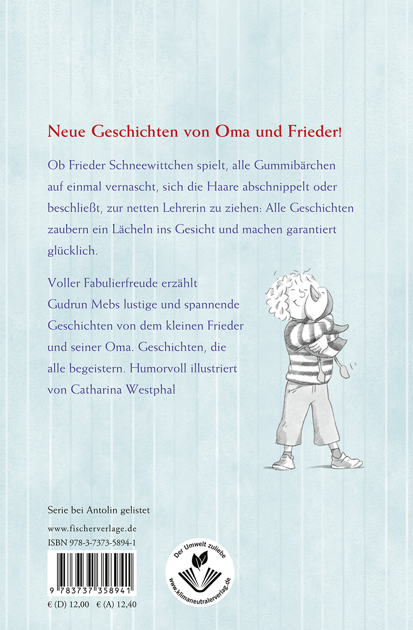 Ob Frieder Schneewittchen spielt, alle Gummibärchen auf einmal vernascht, sich die Haare abschnippelt oder beschließt, zur netten Lehrerin zu ziehen: Alle Geschichten zaubern ein Lächeln ins Gesicht und machen garantiert glücklich. Voller Fabulierfreude erzählt Gudrun Mebs lustige und spannende Geschichten von dem kleinen Frieder und seiner Oma. Geschichten, die alle begeistern.