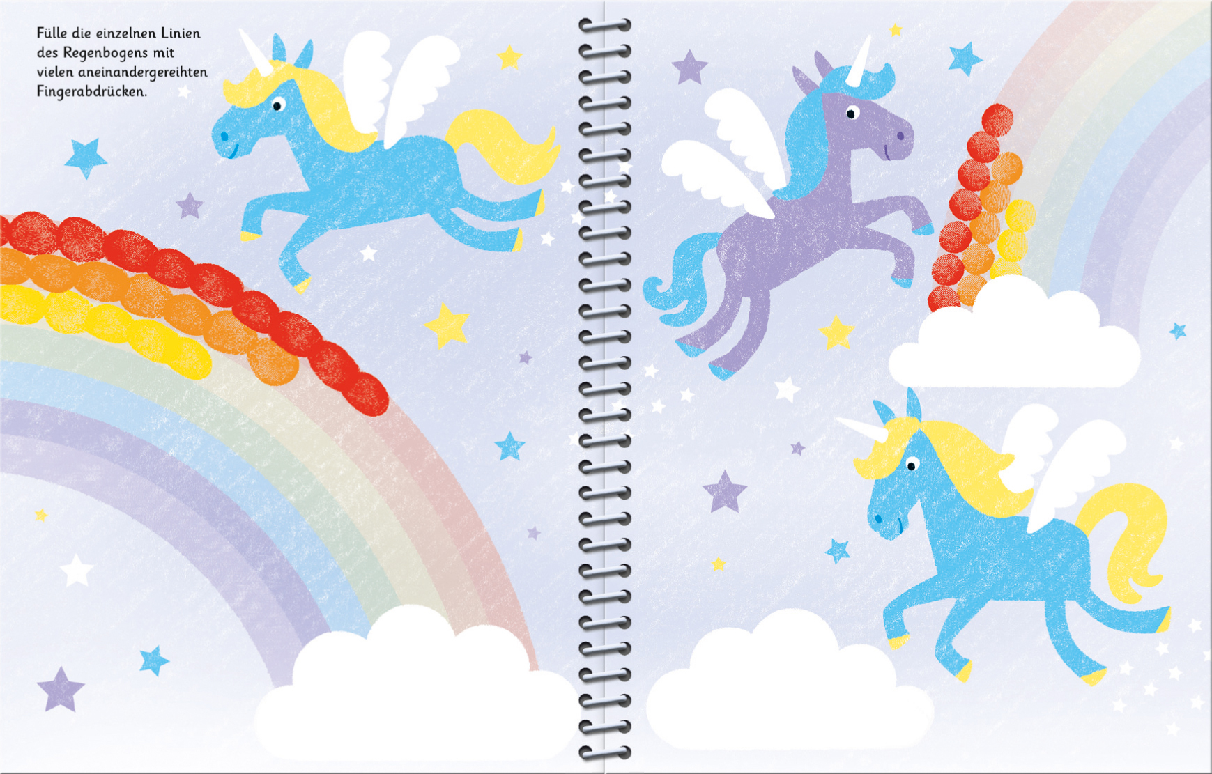 Ein Fingerabdruck hier, ein paar Striche dort - schon galoppieren Einhörner über den Regenbogen und Feen schweben über Blumenwiesen. Mit sieben Stempelfarben, Schritt-für-Schritt-Anleitungen und jeder Menge Platz zum Stempeln und Malen.