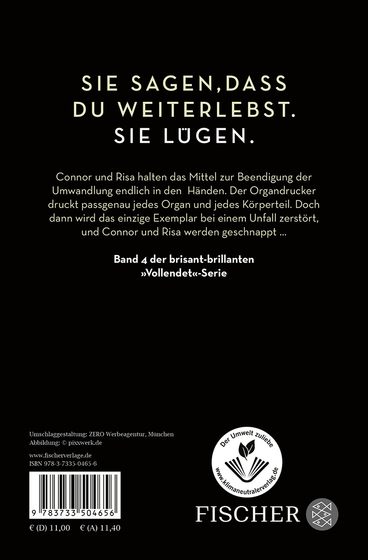 Connor und Risa halten das Mittel zur Beendigung der Umwandlung endlich in den Händen. Der Organdrucker druckt passgenau jedes Organ und jedes Körperteil. Dank seiner Technik braucht niemand mehr die Körperteile unerwünschter Teenager. Doch dann wird das einzige Exemplar bei einem Unfall zerstört, und Connor und Risa werden geschnappt. Ihre Flucht und ihre Hoffnung auf ein gemeinsames Leben scheint endgültig ein Ende gefunden zu haben.