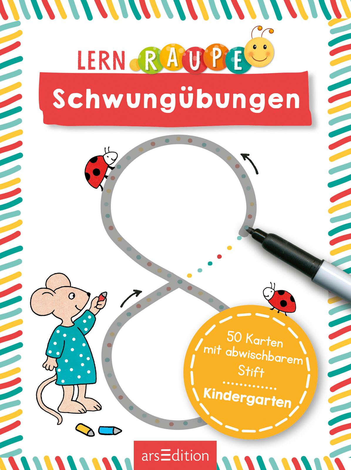 Diese Box enthält 50 bunte Lernkarten und einen abwischbaren Stift. Damit können alle Schwungübungen immer wieder geübt werden.