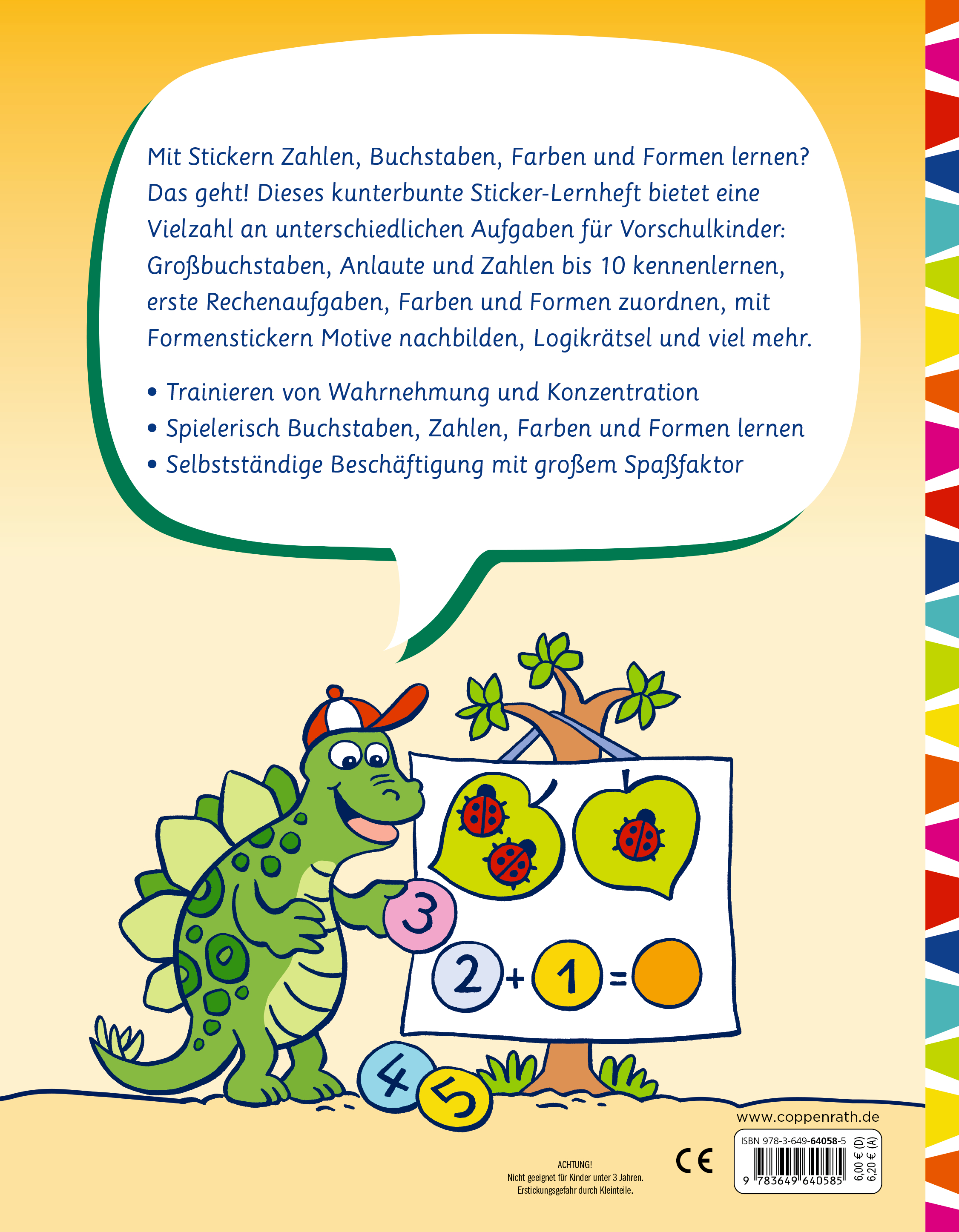 Mit Stickern Zahlen, Buchstaben, Farben und Formen lernen? Das geht! Dieses kunterbunte Sticker-Lernheft bietet eine Vielzahl an unterschiedlichen Aufgaben für Vorschulkinder: Großbuchstaben, Anlaute und die Zahlen bis 10 kennenlernen, erste Rechenaufgaben, Farben und Formen zuordnen, mit Formenstickern Motive nachbilden, Logikrätsel und viel mehr. - Über 250 Sticker- Trainieren von Wahrnehmung, Konzentration und Auge-Hand-Koordination- Spielerisch Buchstaben, Zahlen, Farben und Formen lernen- Selbstständige Beschäftigung mit großem SpaßfaktorEin ideales Geschenk für alle Vorschulkinder oder zur Einschulung!