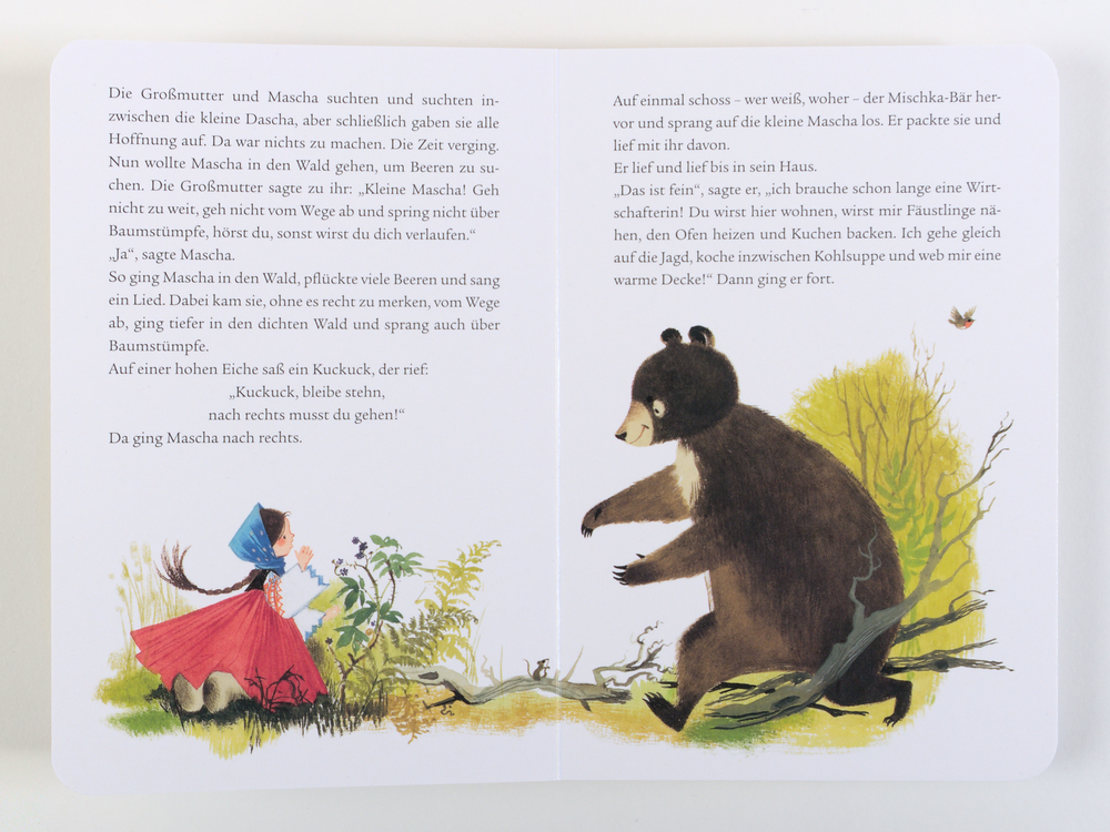 Die Geschwister Mascha und Dascha leben mit ihrer Großmutter im Wald. Eines Tages fängt Mischka, der Bär, die kleine Dascha und bringt sie in sein schönes Haus. Sie soll Ordnung schaffen. Doch nichts gelingt ihr. Kurz darauf fängt er ihre Schwester Mascha. Sie soll nun alles sauber halten. Da sie alles richtig macht, gewährt Mischka ihr einen Wunsch. Und das kluge Mädchen ersinnt eine List. Die liebevollen Zeichnungen von Ingeborg Meyer-Rey ziehen die Leser_innen mit viel Gefühl in die Geschichte hinein - egal, ob Groß oder Klein.