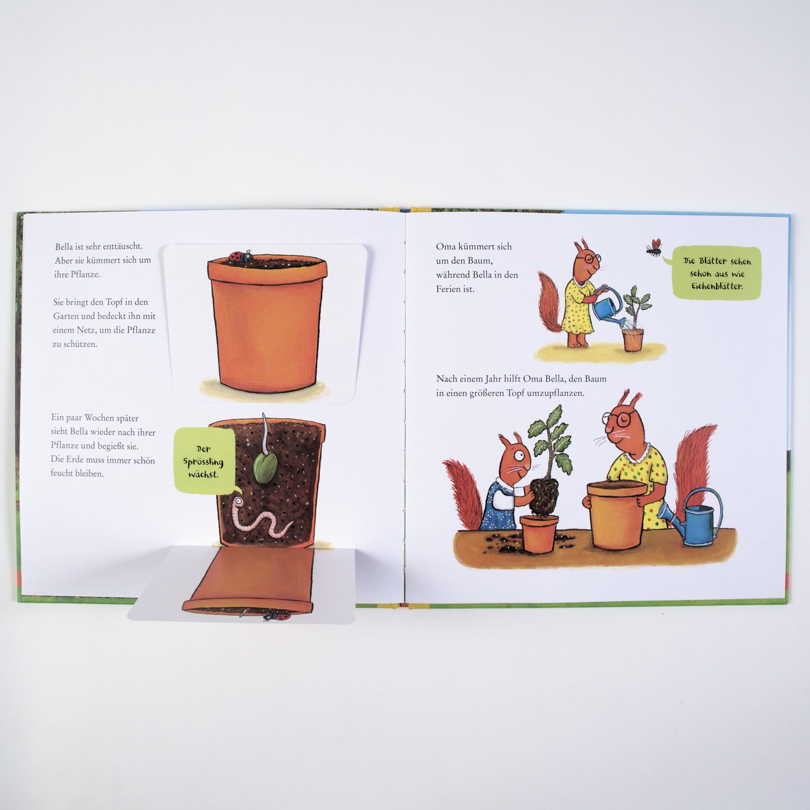 Bella, das kleine Eichhörnchen, pflanzt eine Eichel in den Topf: Sie braucht viel Geduld, bis daraus ein Setzling wird, den sie umtopfen und aussetzen kann. Sie kann es kaum erwarten, bis aus der Eichel ein Baum wird ... Ein tolles Pflanzen-Bilderbuch von einem der beliebtesten Illustratoren. Mit vier Klappen, hinter denen sich Ratschläge von Regenwurm & Marienkäfer verstecken, und einem tollen Pop-up Bild.