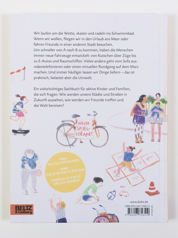 Menschen sind ständig unterwegs, laufen, radeln, skaten. Damit sie schneller von A nach B kommen, haben sie Fahrzeuge entwickelt. Von Kutschen, Flößen und Segelfliegern zu E-Autos und Raumschiffen. Auch virtuell können wir uns bewegen, videochatten oder einen Rundgang auf dem Mars machen. Immer häufiger lassen wir Dinge liefern - das ist praktisch, belastet aber die Umwelt.Ein vielschichtiges Sachbuch für aktive Kinder und Familien, die sich fragen: Wie werden unsere Städte in Zukunft aussehen, wie werden wir Freunde treffen, zur Schule kommen und die Welt bereisen? Bewegung ist immer und überall:Erde: Erdrotation, Wind, Wasser & SchwerkraftNatur: Zugvögel, Pflanzen neigen sich der Sonne zuMensch: Blutkreislauf, Zellteilung, Gedankenreisen und GehirnjoggingFrüher, heute und in Zukunft:Menschheit: Nomadentum, Entdeckerreisen, Migration und FluchtVirtuelle Mobilität: Arbeiten, Lernen und ReisenNeue Technik: E-Mobilität, Wasserstoff, selbstfahrende Autos, Hyperloop, LufttaxisEntdecke unsere Sachbücher mit den relevanten Fragenstellungen unserer Zeit und unserer Zukunft. Für Kinder erklärt.-MÜLL. Alles über die lästigste Sache der Welt. -VOLL UNFAIR! Über Gerechtigkeit und Fairness.-WIE VIEL WÄRMER IST 1 GRAD? Was beim Klimawandel passiert. -OHNE WASSER GEHT NICHTS! Alles über den wichtigsten Stoff der Welt. -DAS IST AUCH MEINE WELT. Wie können wir sie besser machen?-WAS IST ZUHAUSE? Vom Wohnen, Leben, Weggehen und Ankommen.-WIR MENSCHEN UND DAS MEER. Ozeane Nahrung, Strom und Rohstoffe liefern und das Klima beeinflussen.-DIE GANZE WELT STECKT VOLLER ENERGIE. Alles über die Kraft, die uns antreibt.-DIE VIELFALT DER NATUR. Warum wir Biodiversität brauchen und wie wir sie erhalten können. Erforscht die Vielfalt in Natur und Gesellschaft! Wichtige Themen unserer Zeit - anschaulich erklärtUmweltfreundliche Ausstattung, u. a. durch 100 % Recyclingpapier, Öko-Druckfarben und Verzicht auf FolienkaschierungAnsprechend und lebendig illustriertAuch Erwachsene lernen hier noch etwas