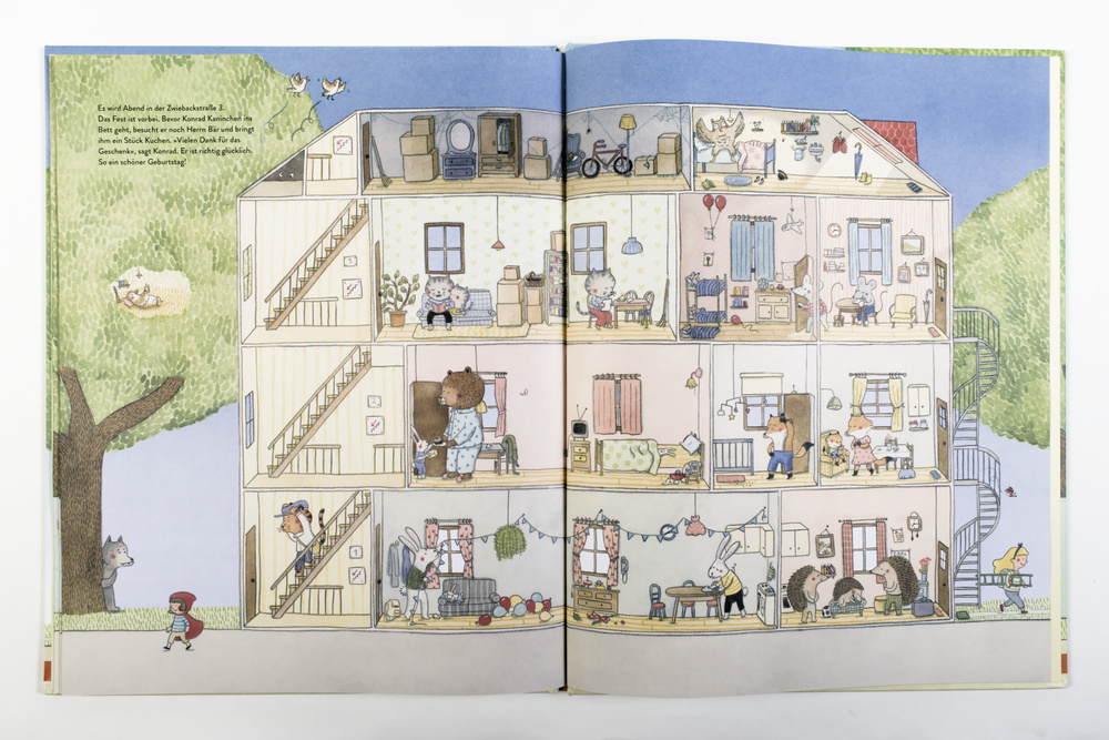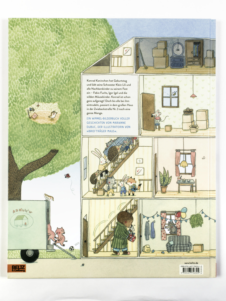 Das kleine Kaninchen hat Geburtstag und alle Nachbarn zum Fest eingeladen! In wunderbar detailreichen Querschnittsbildern sieht man, was an diesem spannenden Tag in den Wohnungen passiert, bis sich alle bei Familie Kaninchen treffen: Klein Lili hilft Kuchen backen, Igor Igel wartet sehnsüchtig auf Papa, das Fuchskind im ersten Stock auf das Geschwisterchen, die Mäusekinder richten ein Tohuwabohu an und im zweiten Stock zieht Familie Katze ein. Ein großes, liebevolles Wimmel-Bilderbuch, in dem sich viele kleine Geschichten zum Immer-Wieder-Lesen verstecken.