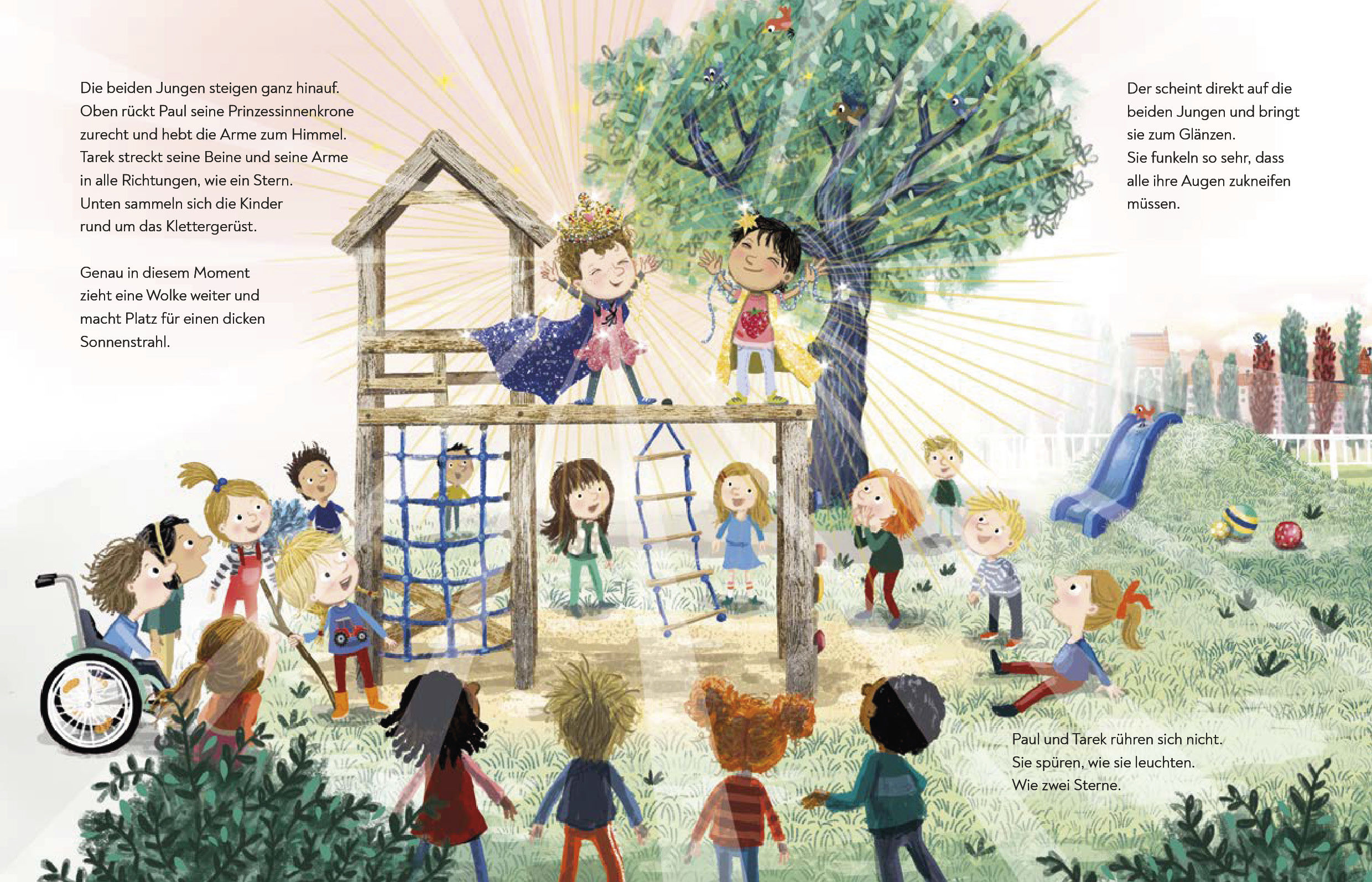 Paul findet im Kindergarten eine Glitzerkrone. Aber sein Freund Tarek meint, dass nur Mädchen mit Glitzersachen spielen. Was passiert denn wohl, wenn es ein Junge trotzdem macht? Vielleicht gibt es eine Explosion? Oder er verwandelt sich in einen Glitzerstern? Paul und Tarek sind mutig und probieren es aus, selbst wenn die anderen lachen. Und da traut sich auch Tilly was: Sie verteidigt Paul und Tarek! Denn natürlich sind auch Mädchen mutig und stark!