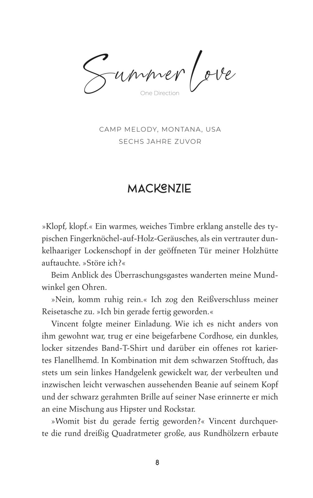 Seit dem Tod ihres Großvaters verbindet die einst leidenschaftliche Songwriterin MacKenzie mit der Musik nichts als Schmerz. Einzig sein Vermächtnis, die jährliche Organisation des Camp Melody, lässt sie für einen kurzen Moment ihren Alltag vergessen. Als sie jedoch erfährt, dass das Ferienlager für Musikbegabte inmitten der Natur Montanas nicht mehr genug Gewinn einbringt, will sie es um jeden Preis retten. Wäre der Schlüssel dazu nicht ausgerechnet Vincent Kennedy, ihr ehemaliger Mitcamper mit den stechend blauen Augen - der Mann, der damals mit ihrem gemeinsam geschriebenen Song über Nacht zum Star wurde ...