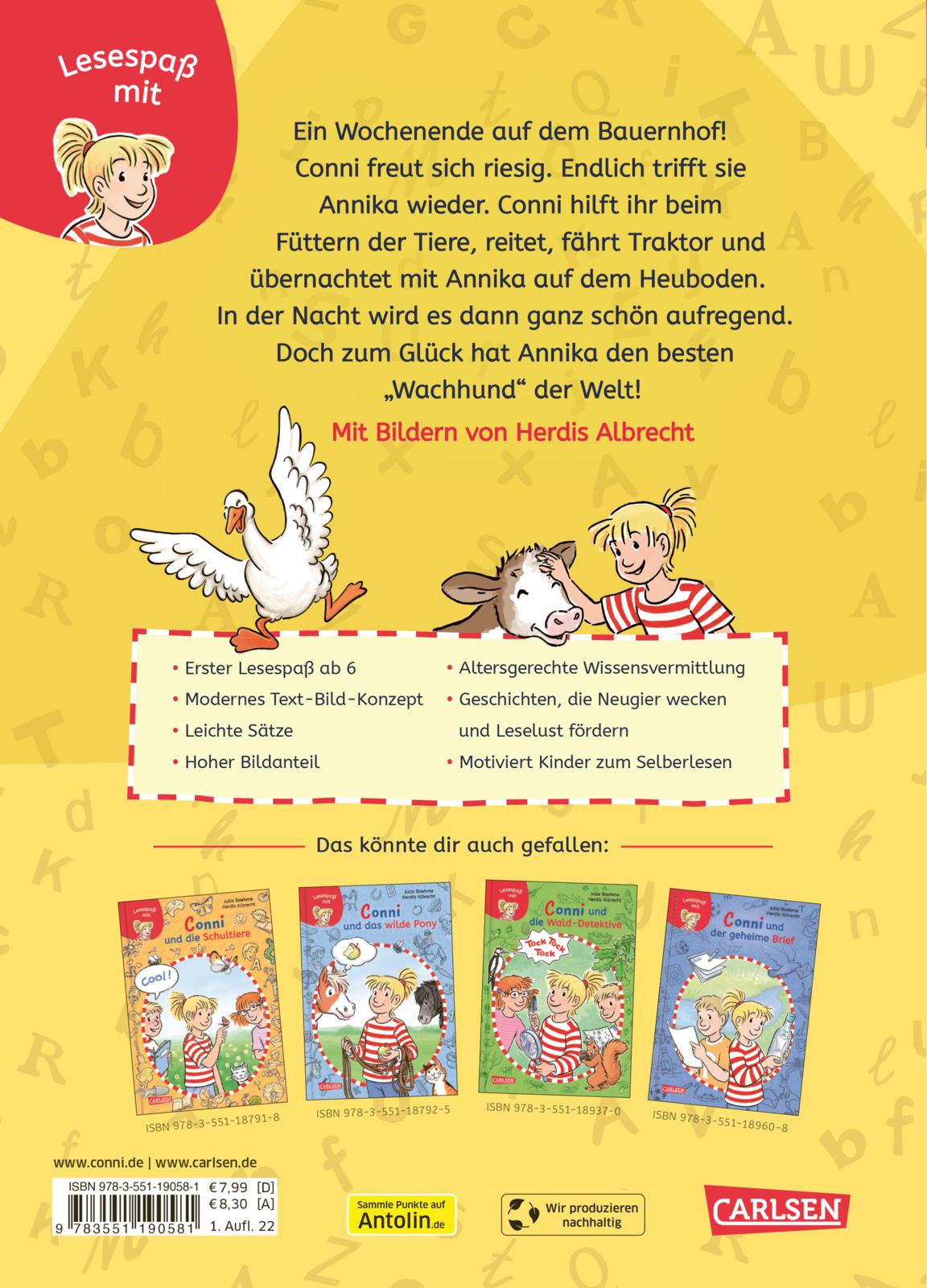 Ein Wochenende auf den Bauernhof! Conni freut sich riesig. Endlich trifft sie Annika wieder. Conni hilft ihr beim Füttern der Tiere, sie reitet, fährt Traktor und übernachtet mit Annika auf dem frisch gefüllten Heuboden. Was für ein Abenteuer! Die Nacht wird es dann nur ganz schön aufregend. Denn war da nicht ein Geräusch? Doch zum Glück hat Annika den besten "Wachhund" der Welt!