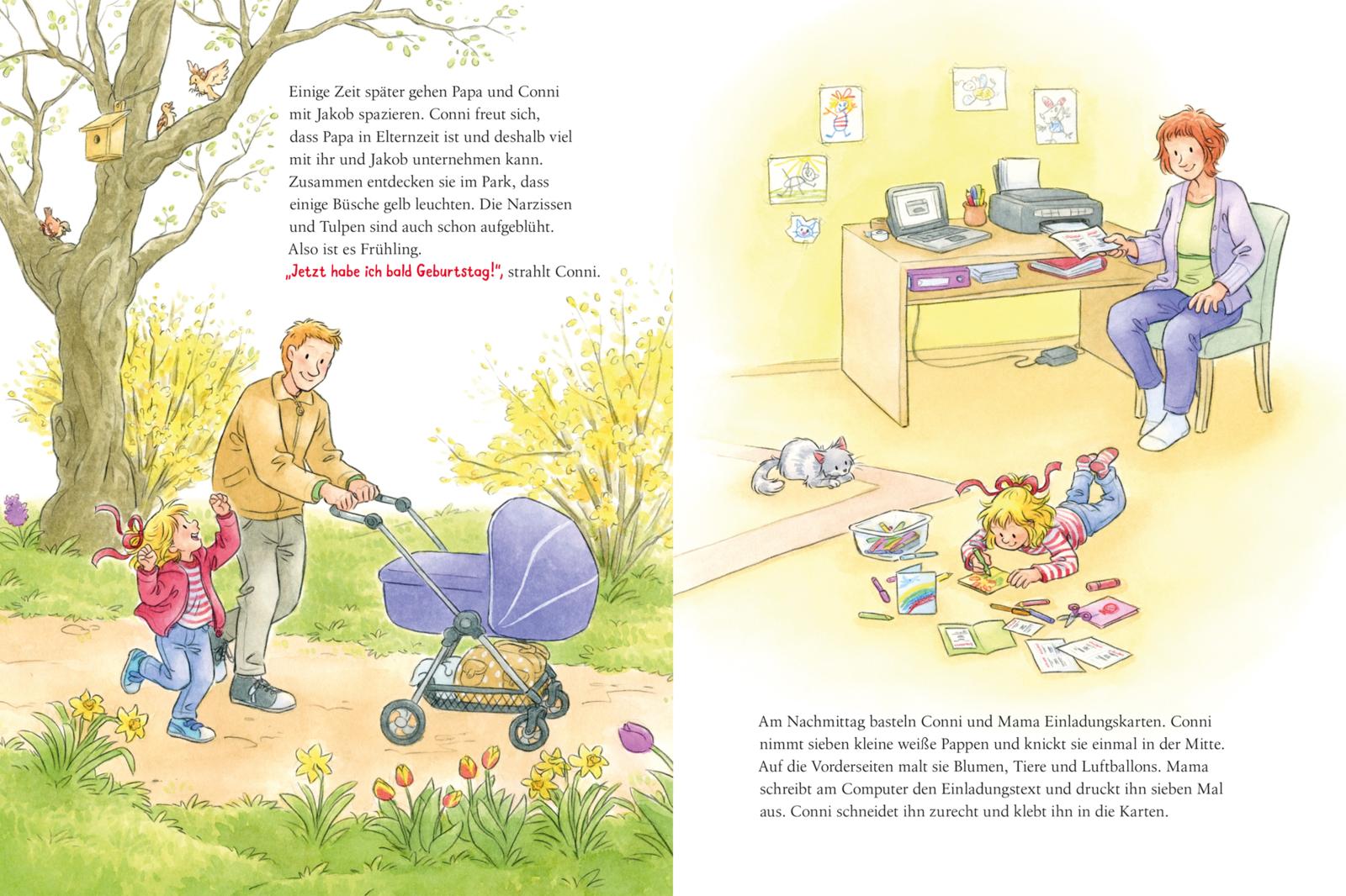 Fünf Jahre zu werden ist schließlich etwas ganz Besonderes. Aber bis zur Geburtstagsparty ist noch einiges zu tun: Zusammen mit Mama bastelt Conni Einladungskarten, mit Papa backt sie leckere Muffins für ihre Freund*innen im Kindergarten und mit beiden Eltern dekoriert sie die Wohnung für das Fest zu Hause.