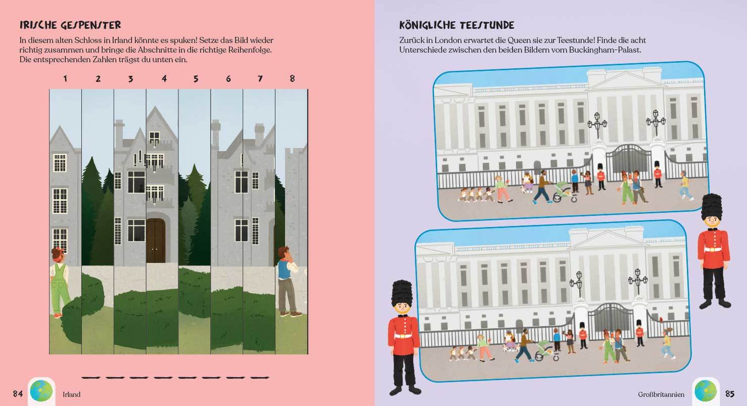 Die unternehmungslustigen Geschwister Paula und Felix aus London begeben sich zusammen mit ihrem Papagei Passepartout auf eine Weltreise, auf der sie 80 Rätsel lösen müssen. Kinder ab 7 Jahren können sie auf ihrem Abenteuer begleiten. Dabei gilt es, Dinge zu suchen, Bilder neu zusammenzusetzen, kleine Worträtsel zu lösen, Punkt-zu-Punkt-Bilder zu zeichnen oder Denkaufgaben zu knacken. Nebenbei erfahren die Weltreisenden, welche berühmten Sehenswürdigkeiten rund um den Erdball zu bestaunen sind: von der Sphinx in Ägypten über das Kolosseum in Rom bis hin zum Adler-Festival in der Mongolei.