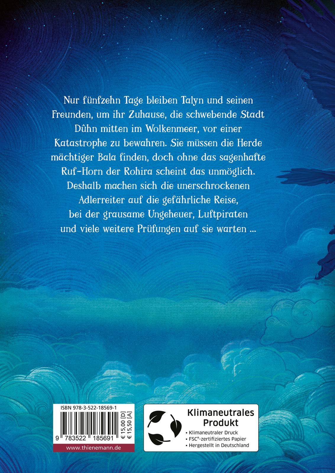 Nur fünfzehn Tage bleiben Talyn und seinen Freunden, um ihr Zuhause, die schwebende Stadt Dûhn mitten im Wolkenmeer, vor einer Katastrophe zu bewahren. Sie müssen die Herde mächtiger Bala finden, doch ohne das sagenhafte Ruf-Horn der Rohira scheint das unmöglich. Deswegen machen sich die unerschrockenen Adlerreiter auf die gefährliche Reise, bei der grausame Ungeheuer, Luftpiraten und viele weitere Prüfungen auf sie warten …
