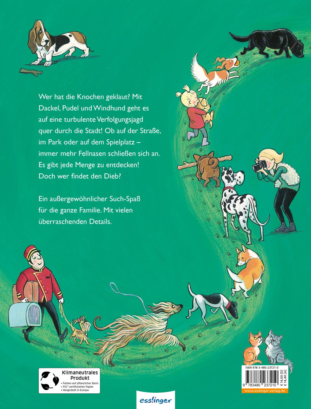 Wer findet den Jungen mit dem leckeren Knochen im Rucksack? Hier können Klein und Groß nicht nur ihre Lieblingsvierbeiner wie Dackel, Pudel, Dalmatiner, Retriever oder Windhunde entdecken. Gemeinsam mit den Spürnasen geht es auf turbulente Verfolgungsjagd quer durch die Stadt. Dort gibt es so viel zu erleben! Auf jeder Doppelseite warten unzählige kleine Geschichten. Und die Spannung steigt! Ob auf der Straße, im Hotel oder auf dem Spielplatz - immer mehr Fellnasen schließen sich an.