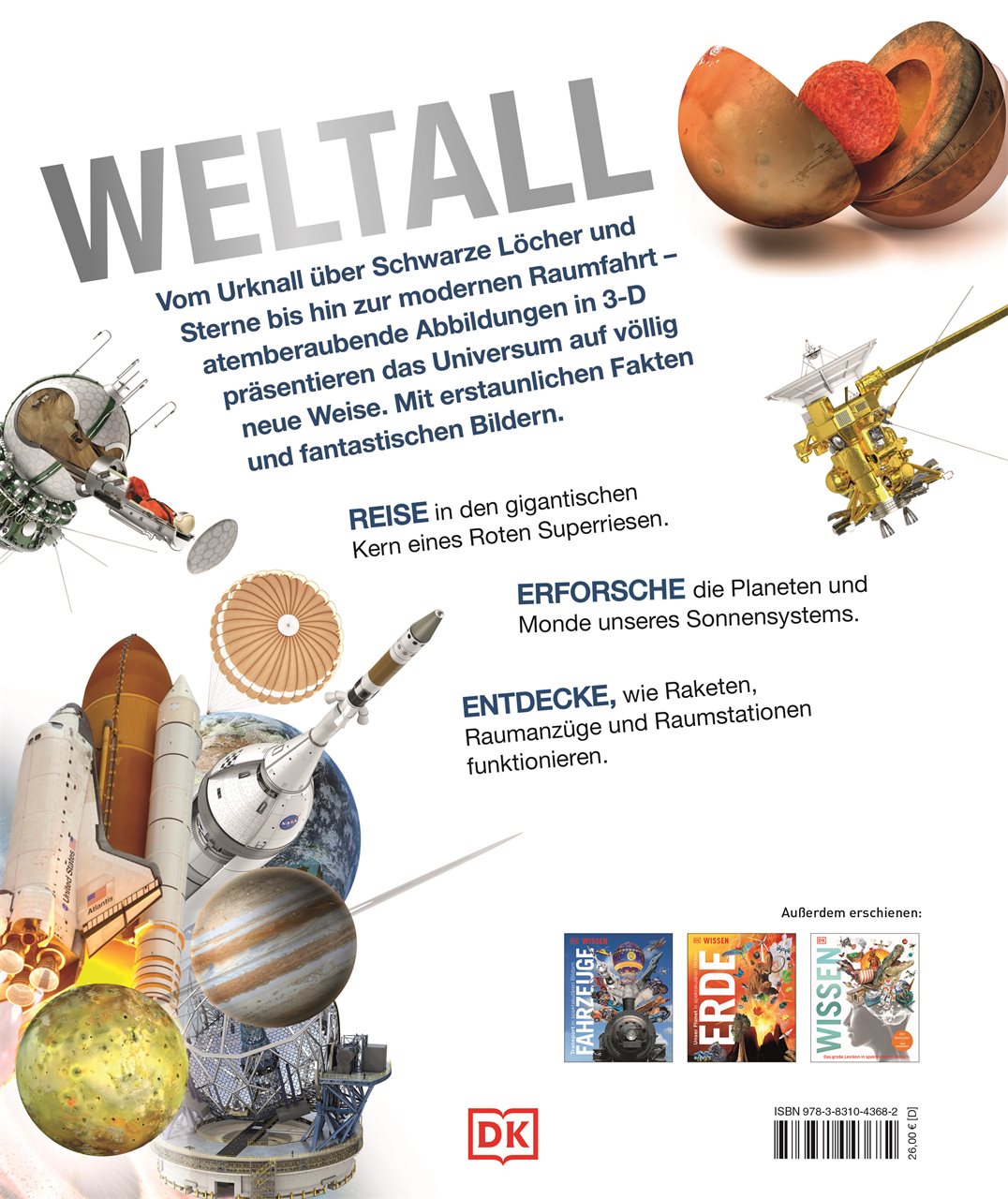 | Schlagworte | 3-D-Grafiken • Astronomie • Buch ab 8 • DK Wissen • DK Wissen Reihe • Galaxie • Galaxien • Geschenk zu Ostern • Himmelskarte • Himmelskörper • Infografiken • Jugendliche • Kinderbuch Sterne und Planeten • Kinderbuch Weltall • Kinderbuch Weltraum • Kindersachbuch • Lexikon • Mars • Milchstraße • Mond • Monde • Nachschlagewerk • ostergeschenk für kinder • Planeten • Rakete • Raumfahrt • Referate • Sachwissen • Sonne • Sonnensystem • SpaceX • Sternbeobachtung • Sternbild • Sternbilder • Sterne • Sternenhimmel • Universum • visuelle Enzyklopädie • Weltraum |