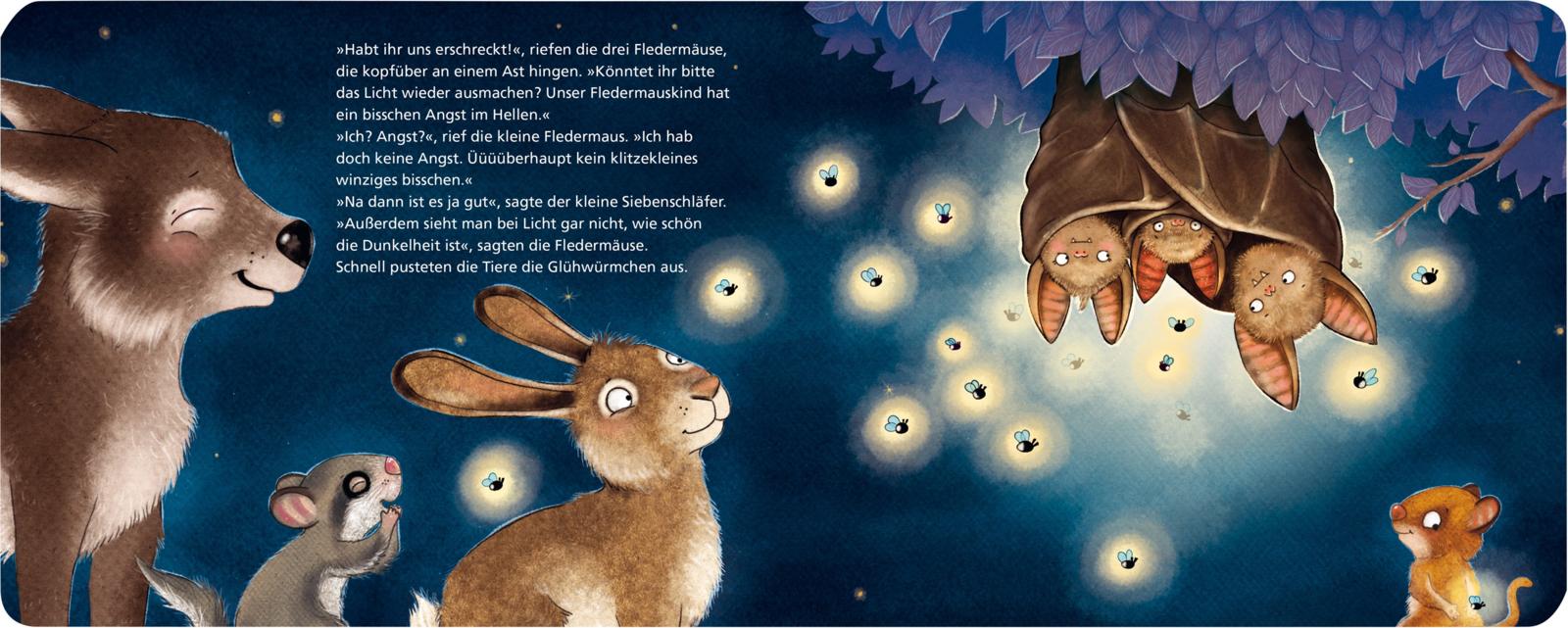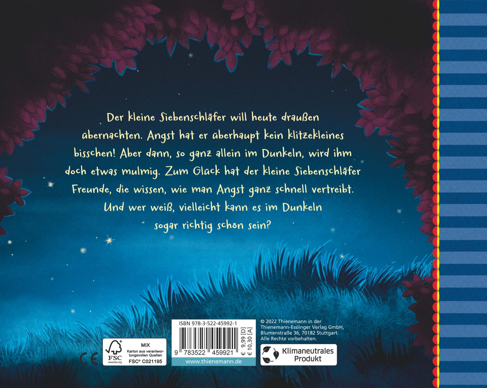 Der kleine Siebenschläfer will heute draußen übernachten. Angst hat er überhaupt kein klitzekleines bisschen! Aber dann, so ganz allein im Dunkeln, wird ihm doch etwas mulmig. Zum Glück hat der kleine Siebenschläfer Freunde, die wissen, wie man Angst ganz schnell vertreibt. Und wer weiß, vielleicht kann es im Dunkeln sogar richtig schön sein?