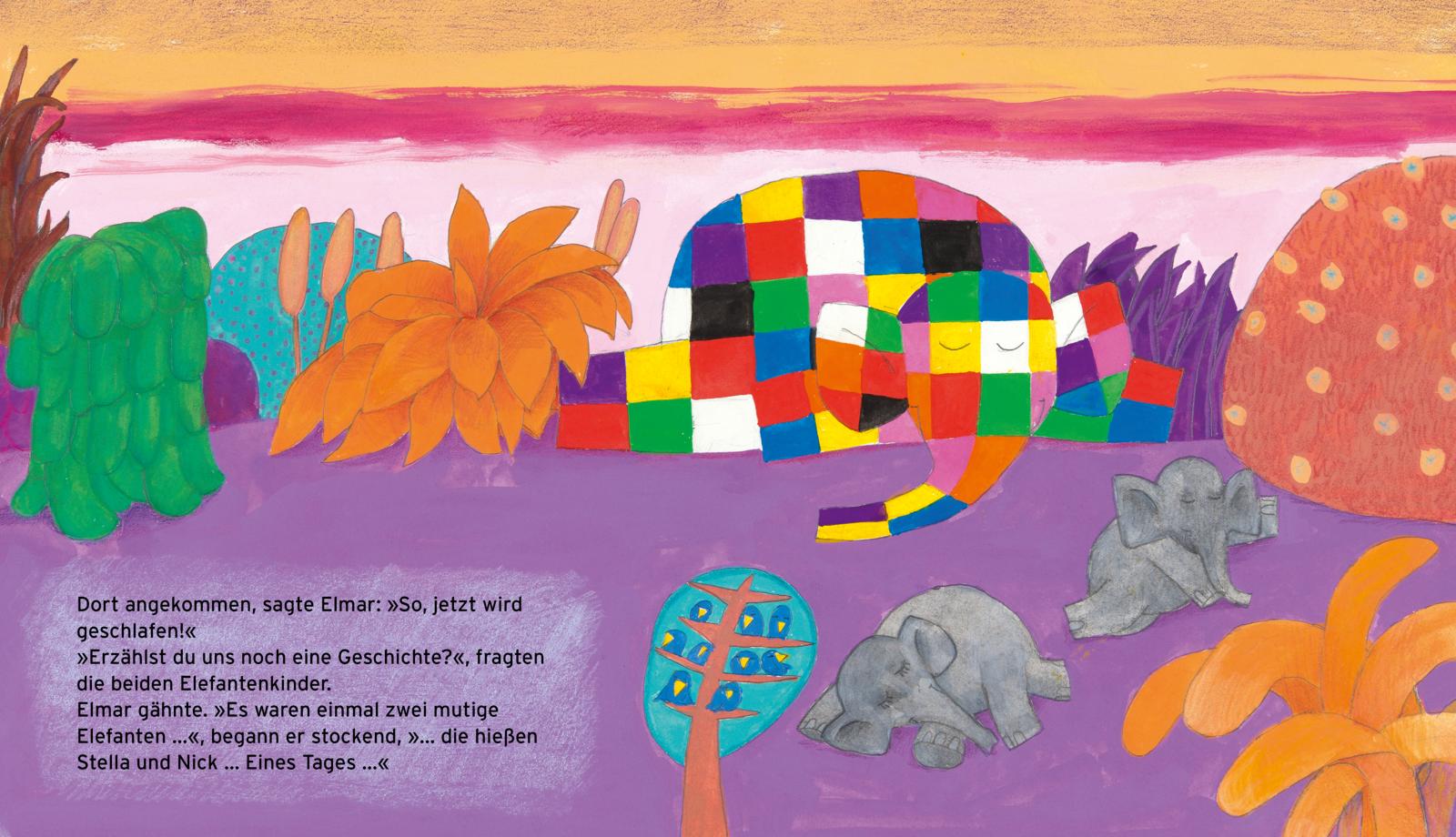 Mit Elmar, dem bunt karierten Babysitter, macht ins Bett gehen Spaß! Zum Vorlesen für Kinder ab 4.