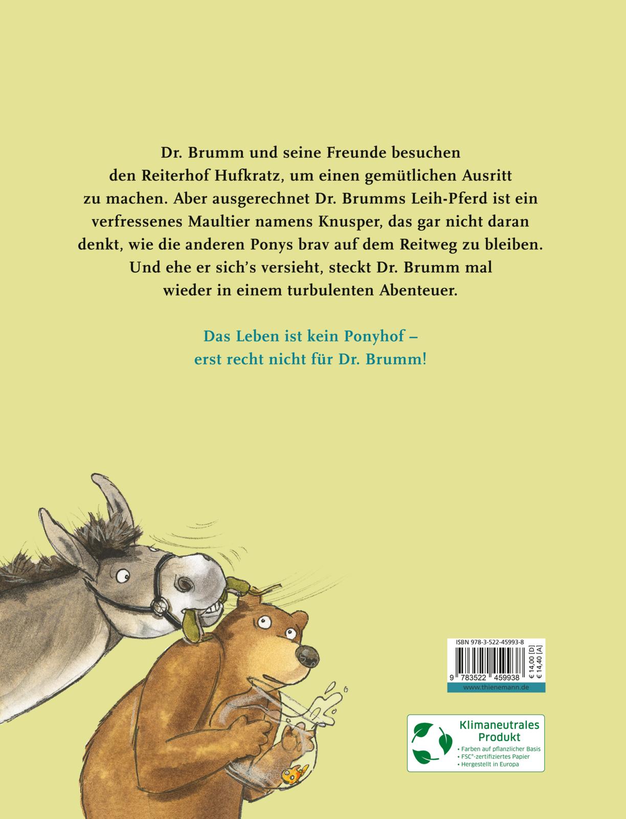 Dr. Brumm und seine Freunde besuchen den Reiterhof Hufkratz, um einen gemütlichen Ausritt zu machen. Aber ausgerechnet Dr. Brumms Leih-Pferd ist ein verfressenes Maultier namens Knusper, das gar nicht daran denkt, wie die anderen Ponys brav auf dem Reitweg zu bleiben. Und ehe er sich's versieht, steckt Dr. Brumm mal wieder in einem turbulenten Abenteuer.