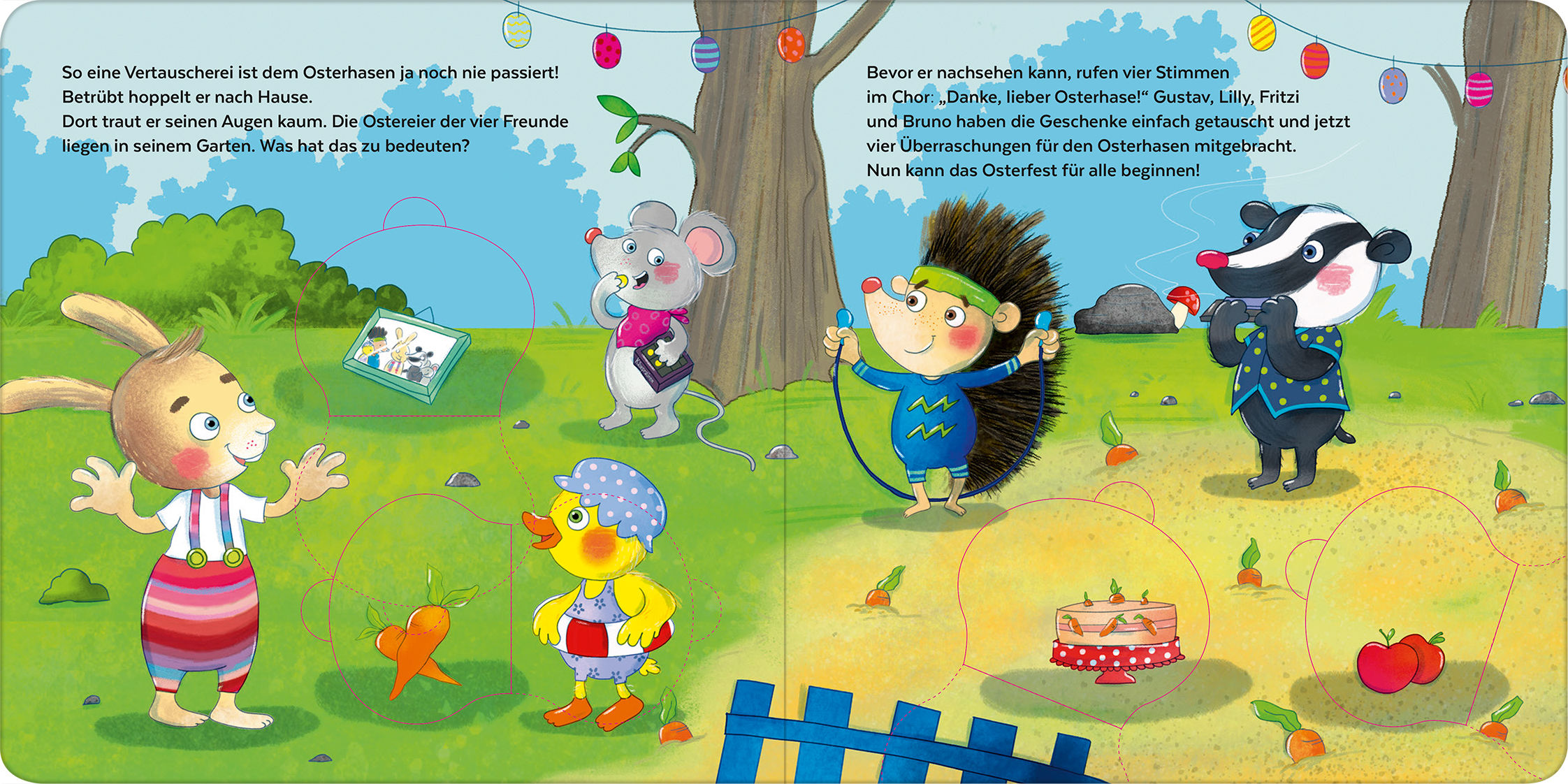 Der Osterhase hat ganz schön viel zu tun, alle Überraschungen für seine Freunde in den Eiern zu verstecken. Für jedes Tier hat er sich was Besonderes ausgedacht! Doch als alle ihre Ostereier gefunden haben, steckt immer das falsche Geschenk im Ei. Oje, so eine verrückte Ei-Vertauscherei! Was soll der Osterhase jetzt nur tun?