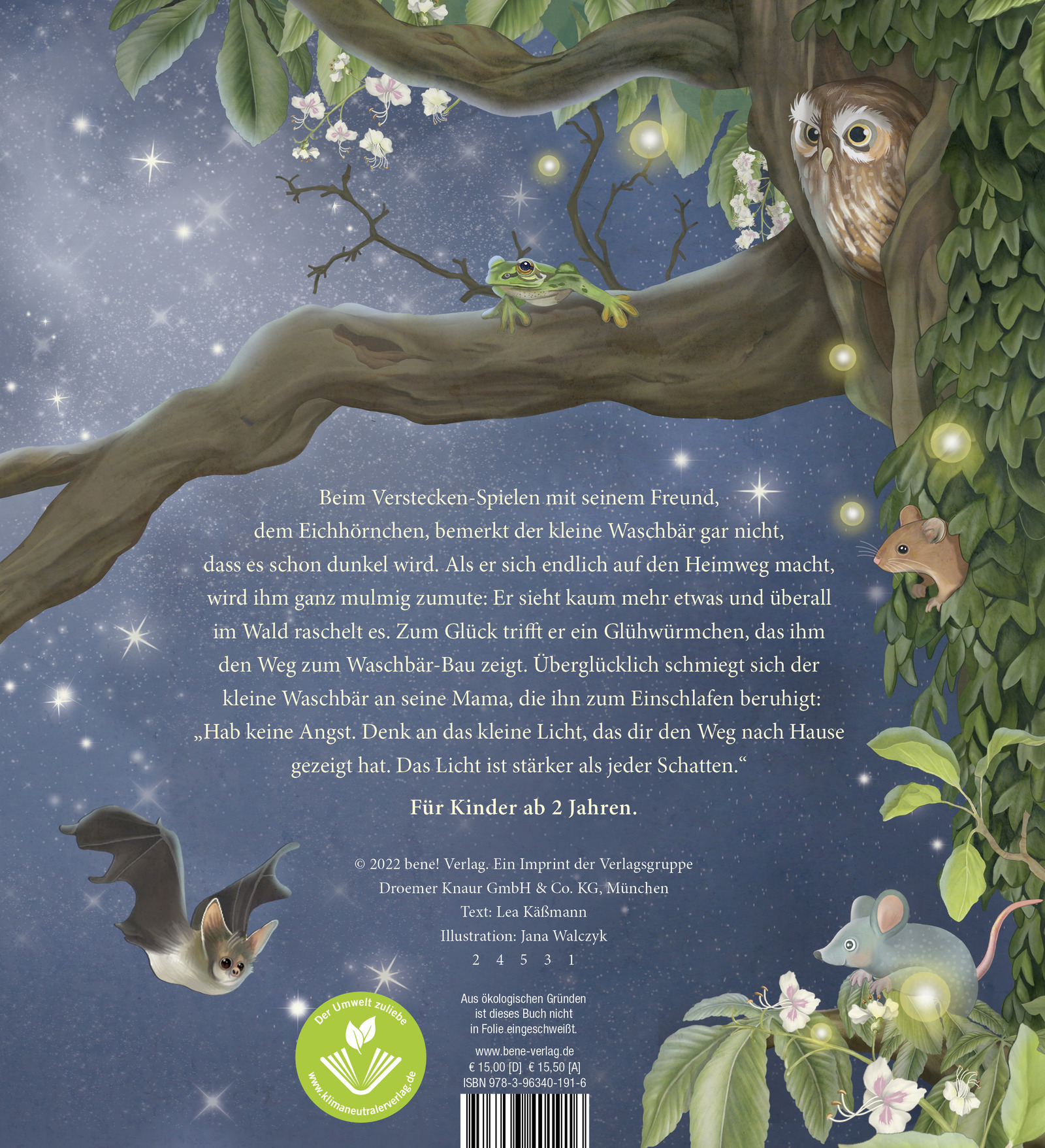 Kurz vor dem Schlafengehen befürchtet der kleine Waschbär, dass er schlecht träumen könnte - es war doch so ein unheimlicher Abend. Da erinnert ihn seine Mama daran: "Du brauchst keine Angst zu haben. Denk an das kleine Licht, das dir den Weg nach Hause gezeigt hat. Das Licht ist stärker als jeder Schatten." Und der Baum, der der Waschbär-Familie Schutz gibt: "Der erinnert mich an Gott. Denn auch Gott ist immer da und sorgt für uns", versichert Mama Waschbär ihrem Nachwuchs und stimmt ein Gutenachtlied an.