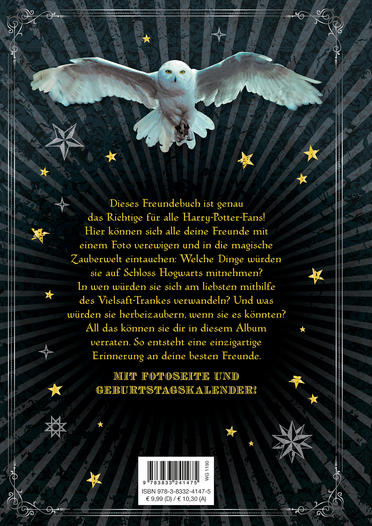 Dieses Freundebuch ist genau das Richtige für alle Harry-Potter-Fans! Hier können sich alle deine Freunde mit einem Foto verewigen und in die magische Zauberwelt eintauchen: Welche Dinge würden sie auf Schloss Hogwarts mitnehmen? In wen würden sie sich am liebsten mithilfe des Vielsaft-Trankes verwandeln? Und was würden sie herbeizaubern, wenn sie es könnten? All das können sie dir in diesem Album verraten. So entsteht eine einzigartige Erinnerung an deine besten Freunde.Mit Fotoseite und Geburtstagskalender!