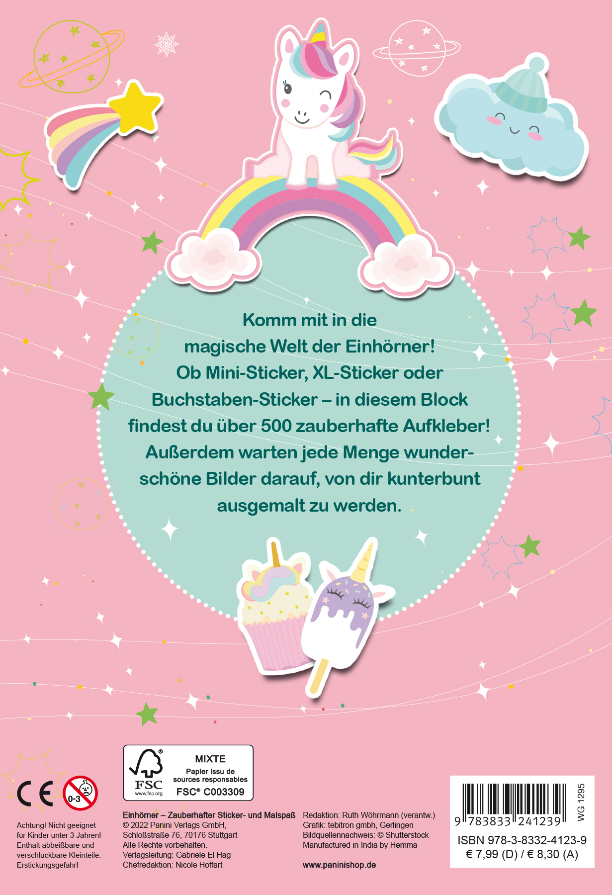 Komm mit in die magische Welt der Einhörner! Ob Mini-Sticker, XL-Sticker oder Buchstaben-Sticker - in diesem Block findest du über 500 zauberhafte Aufkleber! Außerdem warten jede Menge wunderschöne Bilder darauf, von dir kunterbunt ausgemalt zu werden.