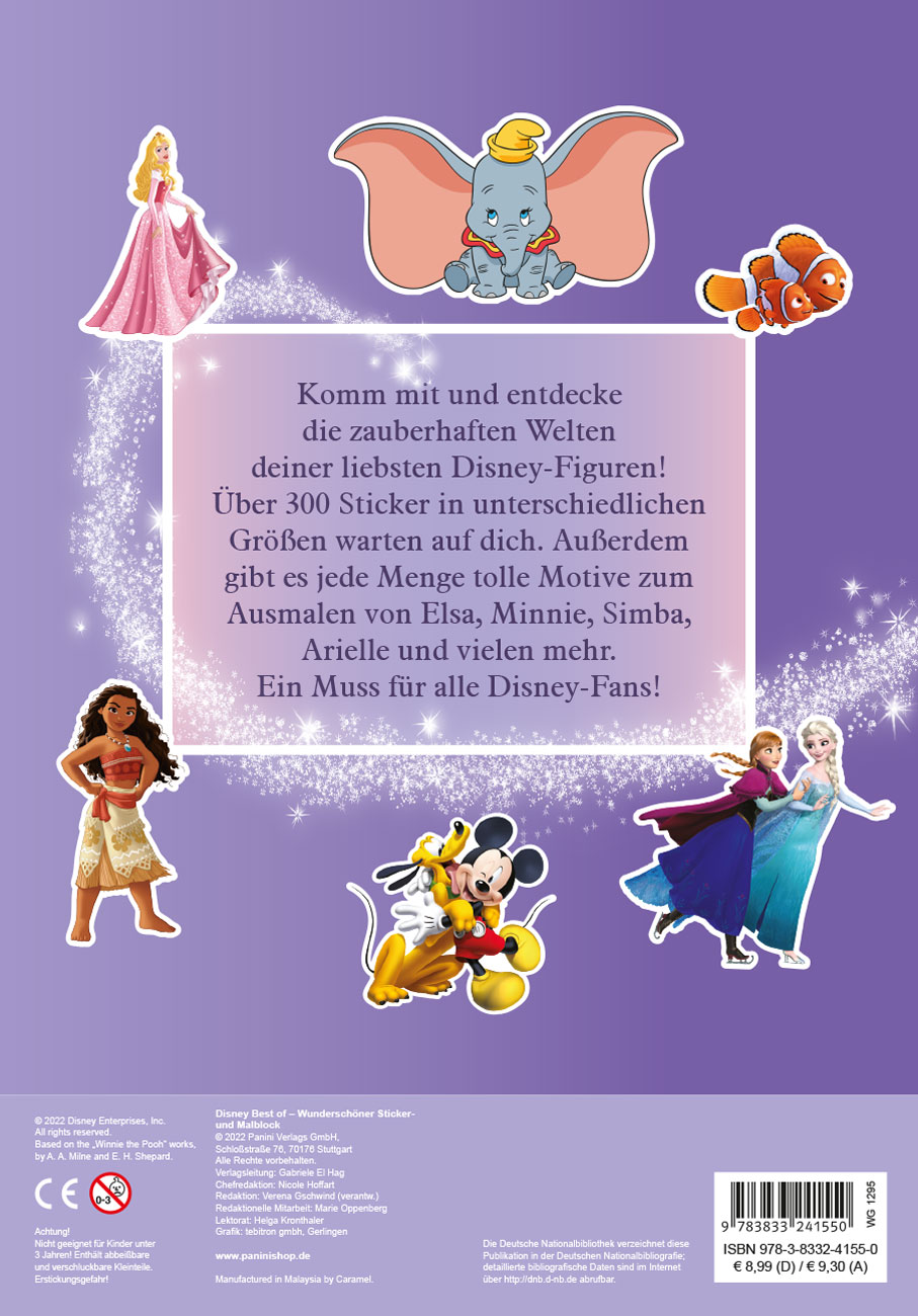 | Schlagworte | Ausmalen • Best of Disney • Disney • DISNEY STICKER • f22 • Kinderbuch • Malblock • Malbuch • Malen • Mal- und Stickerblock • Panini • Panini Books • PB • Sticker • Stickerblock • Sticker- und Malblock |