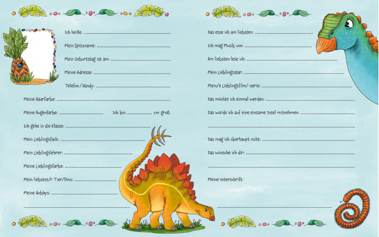 | Schlagworte | Album • Dino • Dinobuch • Dinosaurier • Eintragalbum • Eintragbuch • Erinnerungsalbum • Freunde • Freundealbum • Freundebuch • Freundschaftsbuch • Geschenk • Geschenkidee • Junge • Jungs • Kinder • Schule • Schulfreunde • Schulfreundebuch • Stegosaurus • Triceratops • Tyranosaurus Rex • Uhrzeit |