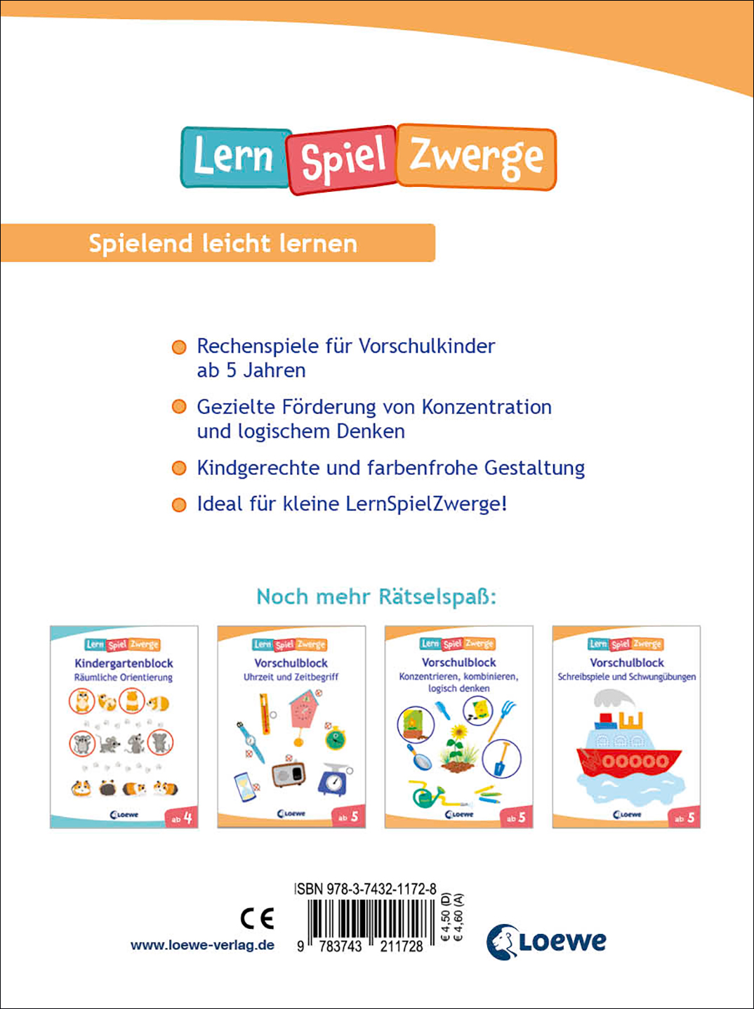 Kinder ab fünf Jahren finden im neuen bunten LernSpielZwerge-Vorschulblock altersgerecht aufbereitete erste Rechenspiele. In insgesamt 40 Rätseln zum Zählen und Üben der Zahlen über einfache Additions- und Subtraktionsaufgaben bis hin zum Verdoppeln und Teilen von Mengen entdecken sie den Spaß an der Welt der Zahlen und werden damit perfekt auf den Schulstart vorbereitet.