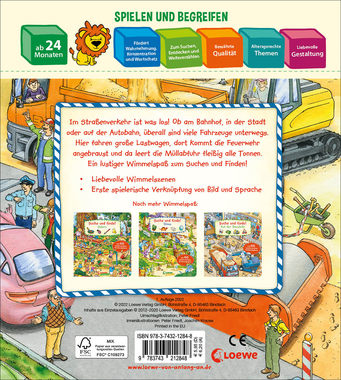 Im Straßenverkehr ist was los! Ob am Bahnhof, in der Stadt oder auf der Autobahn, überall sind viele Fahrzeuge unterwegs. Hier fahren große Lastwagen, dort kommt die Feuerwehr angebraust und da leert die Müllabfuhr fleißig alle Tonnen. Welche Fahrzeuge kannst du noch entdecken? Ein lustiger Wimmelspaß zum Suchen und Finden!