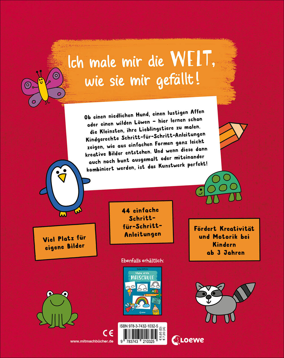 Ob einen niedlichen Hund, einen lustigen Affen oder einen wilden Löwen - hier lernen schon die Kleinsten, ihre Lieblingstiere zu malen. Kindgerechte Schritt-für-Schritt-Anleitungen zeigen, wie aus einfachen Formen ganz leicht kreative Bilder entstehen. Und wenn diese dann auch noch bunt ausgemalt oder miteinander kombiniert werden, ist das Kunstwerk perfekt!