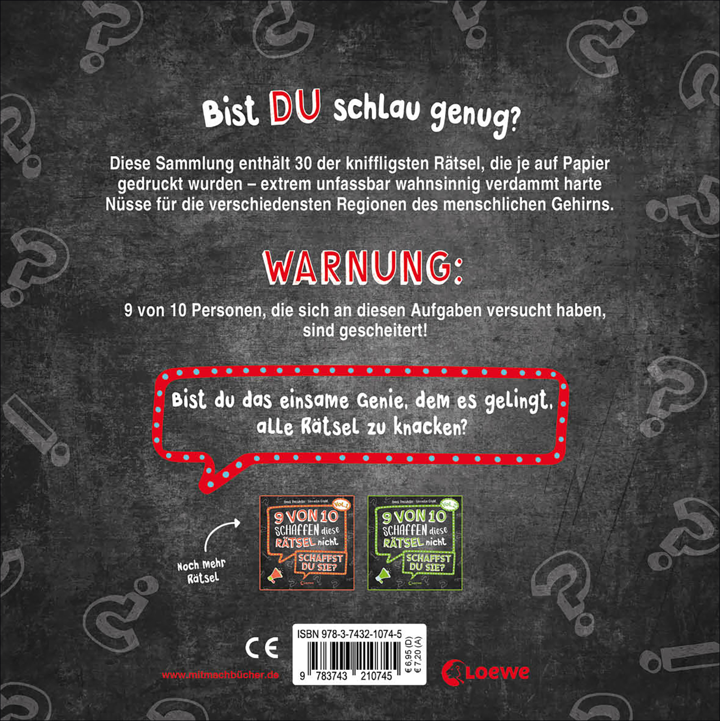 Mit den Rätselbüchern im besonderen Format können sich Kinder ab neun aufwärts der ultimativen Logikherausforderung stellen. Denn nur die wenigsten vermögen es, die ganzseitig illustrierten Rätsel zu meistern! Die Bücher erfordern strategisches und logisches Denken sowie Beobachtungsgabe in spannenden Detektivfällen, gefährlichen Verfolgungsjagden und kniffligen Trickfragen. Auch so mancher Erwachsene wird bei diesen Aufgaben an seine Grenzen stoßen. Viel Spaß – und vor allem Erfolg – bei den 30 Rätseln, die 9 von 10 nicht knacken können!