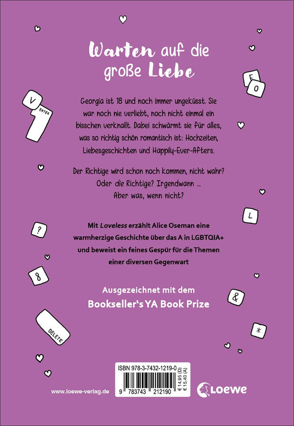"Das überzeugende an ,Loveless' ist, wie genau Oseman Dialoge und Situationen abbildet. ,Loveless' stellt die wesentlich seltenere Frage: Was, wenn man allein bleiben möchte?" Anna Vollmer, Frankfurter Allgemeine Zeitung "Oseman nimmt ihre Leserinnen und Leser in 'Loveless' mit auf eine Reise zur eigenen sexuellen Identität und sie folgen der Protagonistin auf deren Weg, sich so zu akzeptieren, wie sie ist." Jana Magdanz, Deutschlandfunk "Die 27-jährige Schriftstellerin zeigt großes Einfühlungsvermögen, sprachlichen Witz und ein Gefühl für Spannung und Dramatik. "Loveless" hilft, unterschiedliche Erfahrungen und Gefühle in Bezug auf Dinge wie Sex, Romantik und Intimität auszudrücken." Rolf Brockschmidt, Der Tagesspiegel "LGBTQIA* - für viele sind das nur aneinandergereihte Buchstaben. Mit ihrem Roman 'Loveless' hat die junge britische Autorin Alice Oseman dafür gesorgt, dass wir alle ein bisschen mehr wissen über unsere vielfältige Gesellschaft." Katharina Mahrenholtz, NDR Kultur "Dieser berührende Jugendroman erzählt unaufgeregt von Diversität, Freundschaft, Akzeptanz und von Liebe." MDR Kultur "Ich fand es unterhaltsam und man lernt emotional ganz viel." NDR-Podcast eat.READ.sleep "Was zunächst wie eine x-beliebige High-School-Romanze startet, entwickelt sich zu einer einfühlsam und mitreißend erzählten Geschichte über das A in LGBTQIA+. Alice Oseman legt eine Coming-out-Geschichte der besonderen Art vor." BuchMarkt "Diversität - natürlich, selbstverständlich, ungezwungen. Unbedingt lesen." Wiebke Schleser, BuchSegler "Loveless ist eine angenehme Lektüre, die die Freundschaft der Liebe gleichstellt." frei! Stunde "Oseman hat die verworrenen Gefühle, die Verletzlichkeit und das Unverständnis sich selbst gegenüber in eine Geschichte voller Liebe und Freundschaft, Selbstsuche und Akzeptanz, Trauer und Neuanfang verwoben." Jugendbuch Couch "Mit ihren Worten hat Alice Osman mich zu Tränen gerührt, mich zum Lachen und auch Nachdenken gebracht." Sues Buchwahn "Loveless ist rundum berührend und großartig. Ich fühlte mich so abgeholt, habe unglaublich viel gelernt und die Autorin hat so eine wundervolle Erzählstimme." Kielfeder "Alice Oseman hat mit ,Loveless' eine Geschichte über Diversität, Freundschaft und all den Turbulenzen auf dem Weg zu sich selbst geschrieben. Sie hat die Gedanken und Gefühle von Georgia so authentisch aufs Papier gebannt, dass ich viel gelacht, nachgedacht und zu Tränen gerührt war. Ein absolutes Herzensbuch!" Hertzkleck "Dieses Buch hat mich gelehrt, dass Liebe so viel mehr ist als sexuelle & romantische Liebe. Liebe ist all das, was wir fühlen. Freundschaft ist Liebe. Fürsorglichkeit ist Liebe. Liebe ist überall." Chapteraway "Dieser berührende Jugendroman erzählt unaufgeregt von Diversität, Freundschaft, Akzeptanz und von Liebe, die mehr ist als Romantik und Sex." Britta Selle, MDR KULTUR "Unterhaltsam." Tanja Wessendorf, Kölner Stadt-Anzeiger "Die junge britische Autorin schreibt authentische Young-Adult-Geschichten über Liebe und Freundschaften, in denen es ganz selbstverständlich auch um Genderfragen geht - allerdings niemals belehrend oder aufdringlich." Katharina Mahrenholtz, JuLit "Eine Geschichte, die zeigt, dass es nicht nur eine Art gibt, zu lieben und glücklich zu werden." Buxtehuder Tagblatt