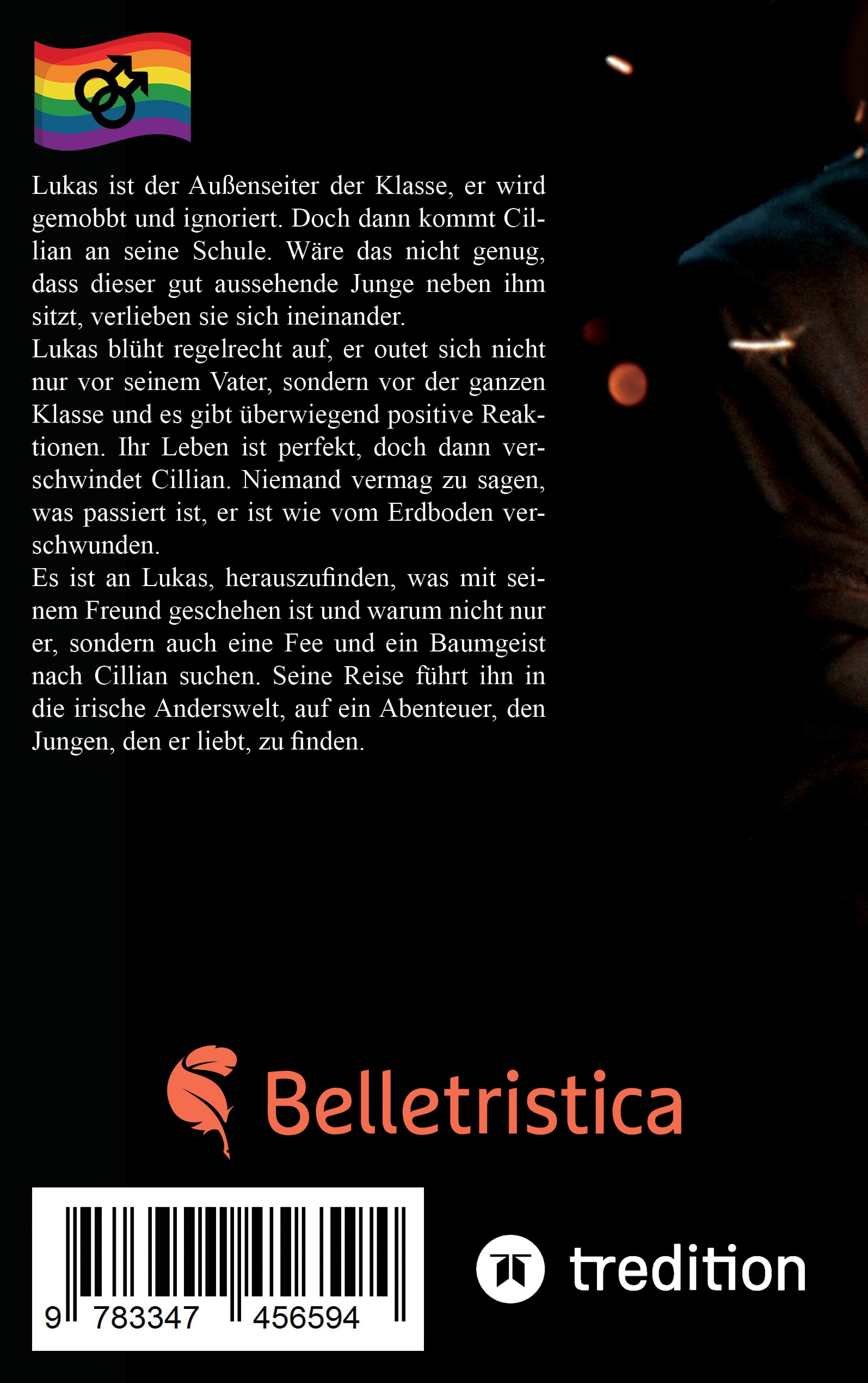 Lukas ist der Außenseiter der Klasse, er wird gemobbt und ignoriert. Doch dann kommt Cillian an seine Schule. Wäre das nicht genug, dass dieser gut aussehende Junge neben ihm sitzt, verlieben sie sich ineinander.Lukas blüht regelrecht auf, er outet sich nicht nur vor seinem Vater, sondern vor der ganzen Klasse und es gibt überwiegend positive Reaktionen. Ihr Leben ist perfekt, doch dann verschwindet Cillian. Niemand vermag zu sagen, was passiert ist, er ist wie vom Erdboden verschwunden.Es ist an Lukas, herauszufinden, was mit seinem Freund geschehen ist und warum nicht nur er, sondern auch eine Fee und ein Baumgeist nach Cillian suchen. Seine Reise führt ihn in die irische Anderswelt, auf ein Abenteuer, den Jungen, den er liebt, zu finden.