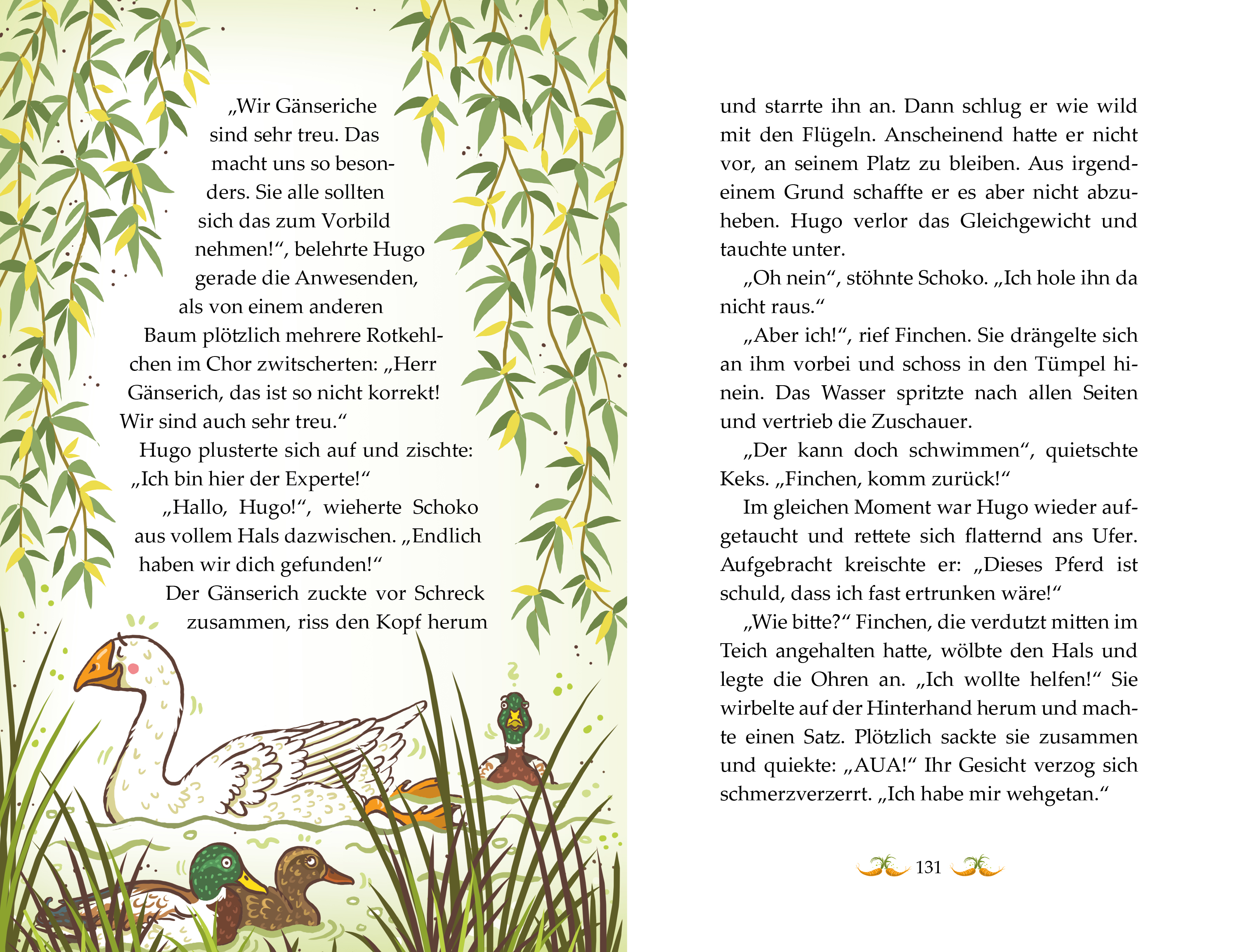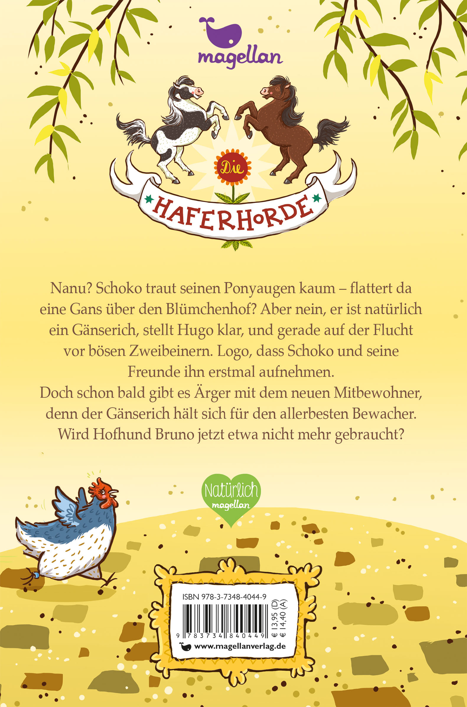 Nanu? Schoko traut seinen Ponyaugen kaum – flattert da tatsächlich eine Gans über den Blümchenhof? Aber nein, er ist natürlich ein Gänserich, stellt Hugo klar. Und er wird verfolgt, von bösen Zweibeinern! Logo, dass Schoko und seine Freunde ihm Unterschlupf gewähren.