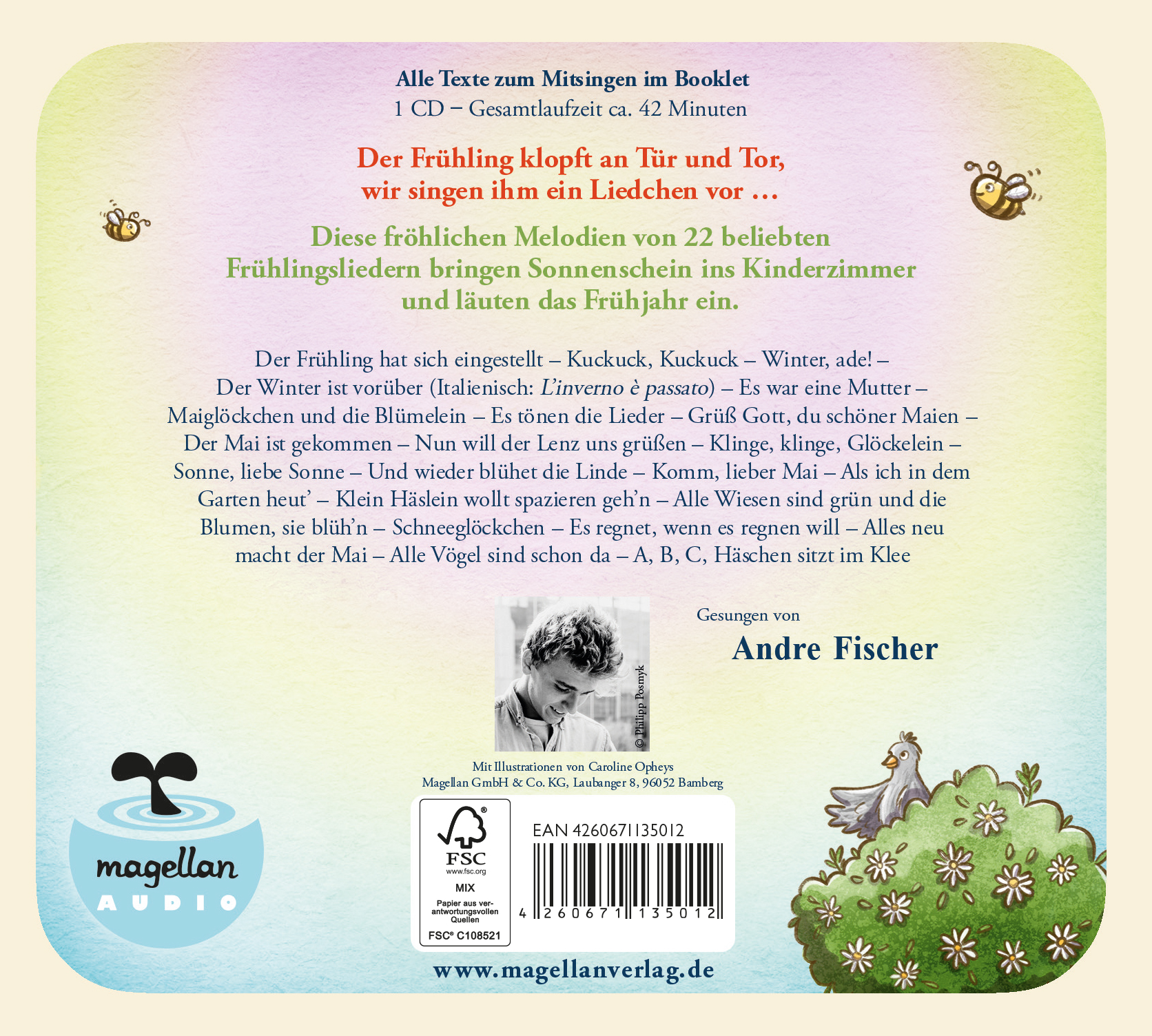 Die Vögel zwitschern, die Blumen sprießen – der Frühling ist da! Und wie begrüßt man die ersten warmen Sonnenstrahlen schöner als mit einem fröhlichen Lied und guter Laune? 21 beliebte Kinder- und Volkslieder laden Kinder zum Tanzen und Mitsingen ein und bringen Stimmung ins Kinderzimmer. Andre Fischer singt diese Klassiker mit modernem Charme. Jahreszeiten sind ein faszinierendes Thema für Kinder im Kindergartenalter, das mit dieser Lieder-CD für Kinder ab 1 Jahr spielerisch und musikalisch erschlossen werden kann. Der Frühling hat sich eingestellt – Kuckuck, kuckuck – Winter ade! – Grüß Gott, du schöner Maien – Es war eine Mutter – Klinge, klinge, Glöckelein – Es tönen die Lieder – Der Mai ist gekommen – Nun will der Lenz uns grüßen – Der Winter ist vorüber (Italienisch: L'inverno è passato) – Sonne, liebe Sonne – Und wieder blühet die Linde – Komm, lieber Mai – Als ich im Garten heut – Klein Häschen wollt spazieren geh’n – Alle Wiesen sind grün und die Blumen, sie blüh’n – Schneeglöckchen – Es regnet, wenn es regnen will – Alles neu macht der Mai – Alle Vögel sind schon da – A, B, C, Häschen sitzt im Klee