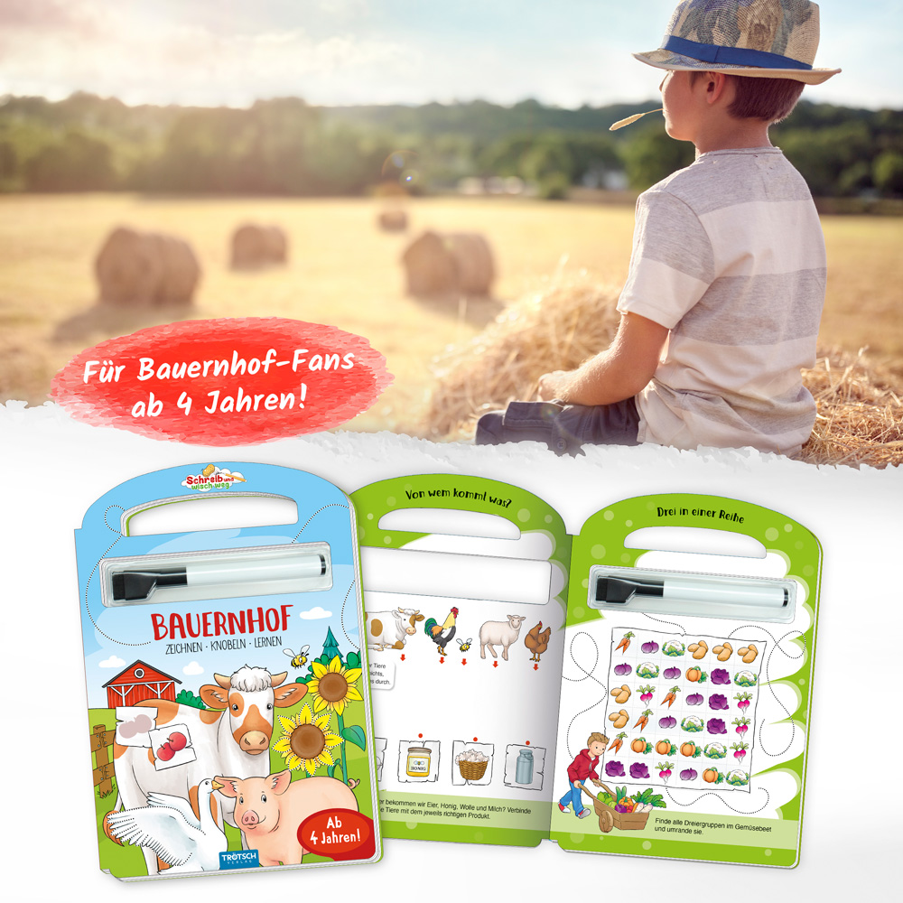 Der fröhliche Knobel- und Zeichenspaß für zuhause und unterwegs: Mit den zahlreichen Rätseln und Zeichenspielen rund um den Bauernhof kommt bestimmt keine Langeweile auf! Malen, Paare finden, Wege durch verschlungene Labyrinthe suchen und viele andere Aufgaben warten in diesem tollen Beschäftigungsbuch auf kleine Bauernhof-Fans. Auch Fehler sind kein Problem: Dank der abwaschbaren Oberfläche lässt sich alles problemlos wegwischen und von vorn beginnen!