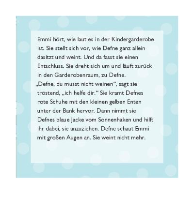 Emmi will heute schnell nach draußen, weil sie mit dem Fahrrad fahren will. Doch gerade, als sie rauslaufen will, merkt sie, dass Defne an ihrer Garderobe sitzt. Sie kann sich noch nicht alleine anziehen und spricht auch nicht so gut. Alle Erzieher sind beschäftigt. Also beschließt Emmi, Defne zu helfen. Als Defne sie anstrahlt und Emmis Namen sagt, freut sich Emmi sehr. Und dann bekommt sie später doch noch das Fahrrad. Was für ein schöner Tag!Ein Emmi-Minibuch zum Thema "Helfen".
