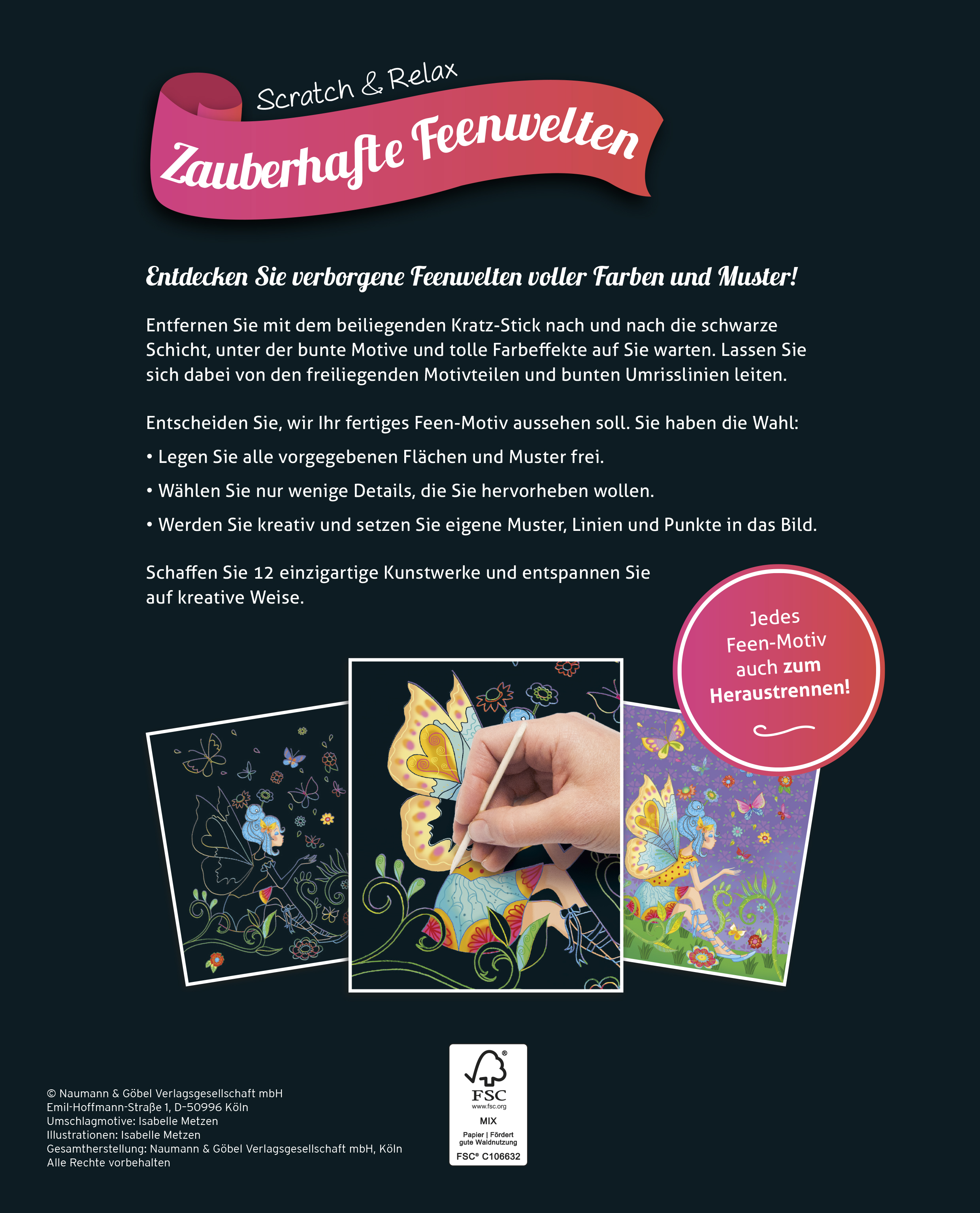 Erwecke 12 wunderschöne Feen-Motive zum Leben. Mit deiner Fantasie machst Sie aus den Kratzbildern wahre Kunstwerke: Hinter der leicht zu entfernenden Schicht zum Abkratzen warten leuchtende Farben und tolle Effekte auf dich. Lege Detail für Detail die fantasievollen Figuren und Szenen frei und setze mit Mustern, Punkten oder Linien eigene kleine Akzente. Mit dem beigelegten Bambus-Stick kannst du direkt loslegen! Die farbigen Umrisslinien leiten dich bei der Auswahl und Freilegung deines Wunschmotivs. "Scratch & Relax", das ist kreatives Entspannen