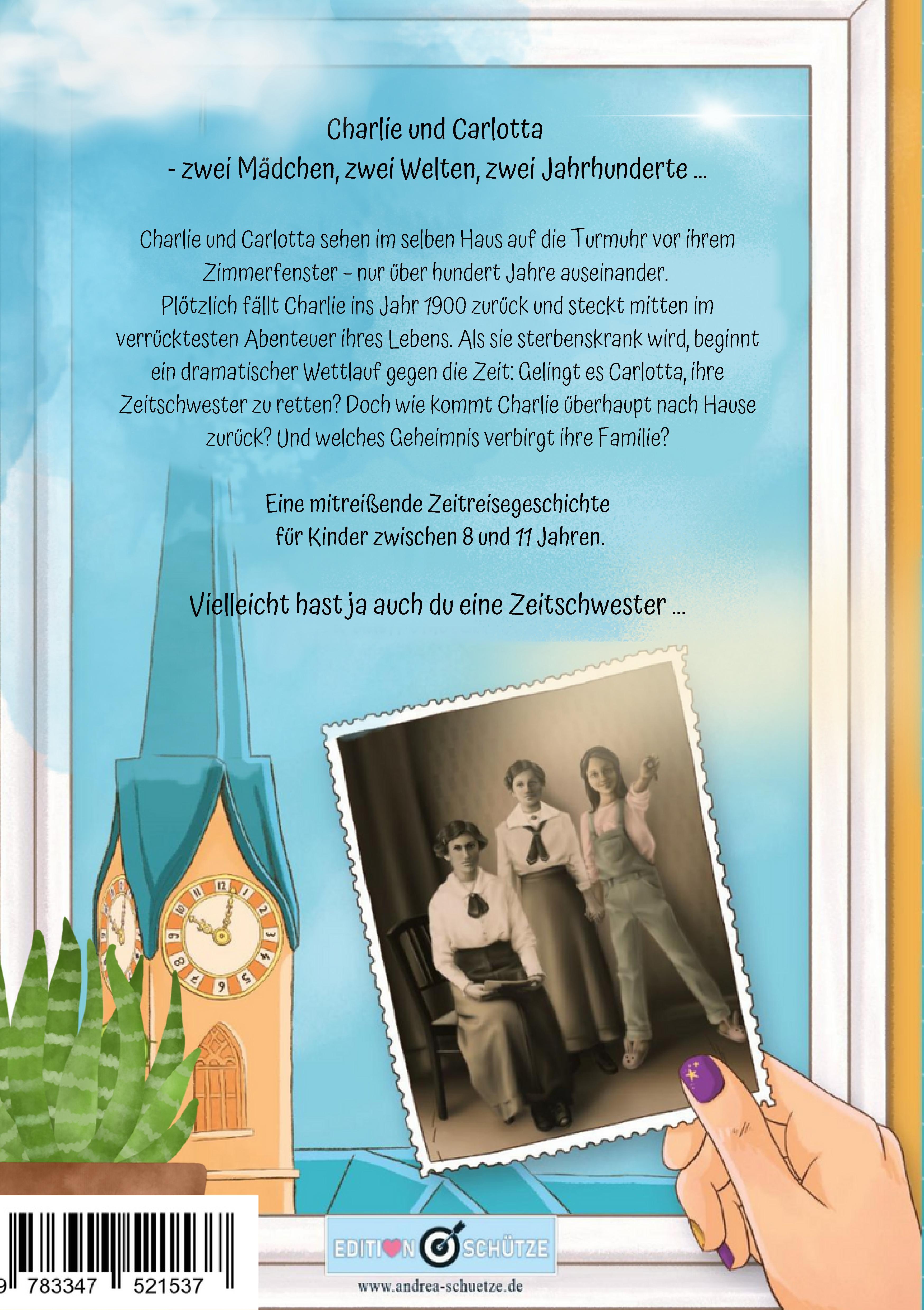 Charlotte Lehmann, genannt Charlie und Carlotta Kant sehen im selben Haus auf die Turmuhr vor ihrem Zimmerfenster - nur über hundert Jahre auseinander. Charlie im Jahr 2021, Carlotta im Jahr 1900. Plötzlich fällt Charlie in die Zeit zurück und steckt mitten im verrücktesten Abenteuer ihres Lebens - und das alles halb im Schlafanzug und mit Hasenhausschuhen an den Füßen! Doch Charlie hat die Reise schon erkältet angetreten und wird immer kranker. Sie muss dringend wieder nach Hause! Doch wie soll das gelingen? Denn ganz allmählich verblassen auch Charlies Erinnerungen und sie ist sich nicht mehr bewusst, dass sie eigentlich aus einer anderen Zeit stammt. Gelingt es Carlotta, ihre Zeitschwester zu retten? Ob Professor Grüning, Carlottas Dienstherr, in diesem dramatischen Wettlauf gegen die Zeit helfen kann?Aber wie kommt Charlie überhaupt nach Hause zurück? Und welches Geheimnis verbirgt ihre Familie? Und was hat Jelena, Charlies dritte Oma, mit der ganzen Sache zu tun?'Zeitschwestern' ist ein Kinderroman, der nachwirkt, weil er Fragen aufwirft: nach den Lebensumständen anno 1900, nach den Paradoxien des Zeitreisens, nach dem Alltag der eigenen Groß- und Urgroßeltern. Er vermittelt Kindern eine Ahnung davon, dass Zeit nicht einfach verrinnt, sondern etwas erschafft. Er zeigt Achtung davor auf, dass die Geschichte eines Menschen weiterlebt, nicht nur in dessen Kindern, sondern auch in dessen Taten, Gedanken und Habseligkeiten. 'Zeitschwestern' schult beim Lesen ganz nebenbei das Gespür für die Vergänglichkeit und das Ohr für das Rauschen der Zeit.Hast auch du eine Zeitschwester?Charlie und Carlotta - zwei Mädchen, zwei Welten, zwei Jahrhunderte: Was passiert, wenn man plötzlich in die Vergangenheit plumpst und dort seine Zeitschwester trifft? Lies selbst ...