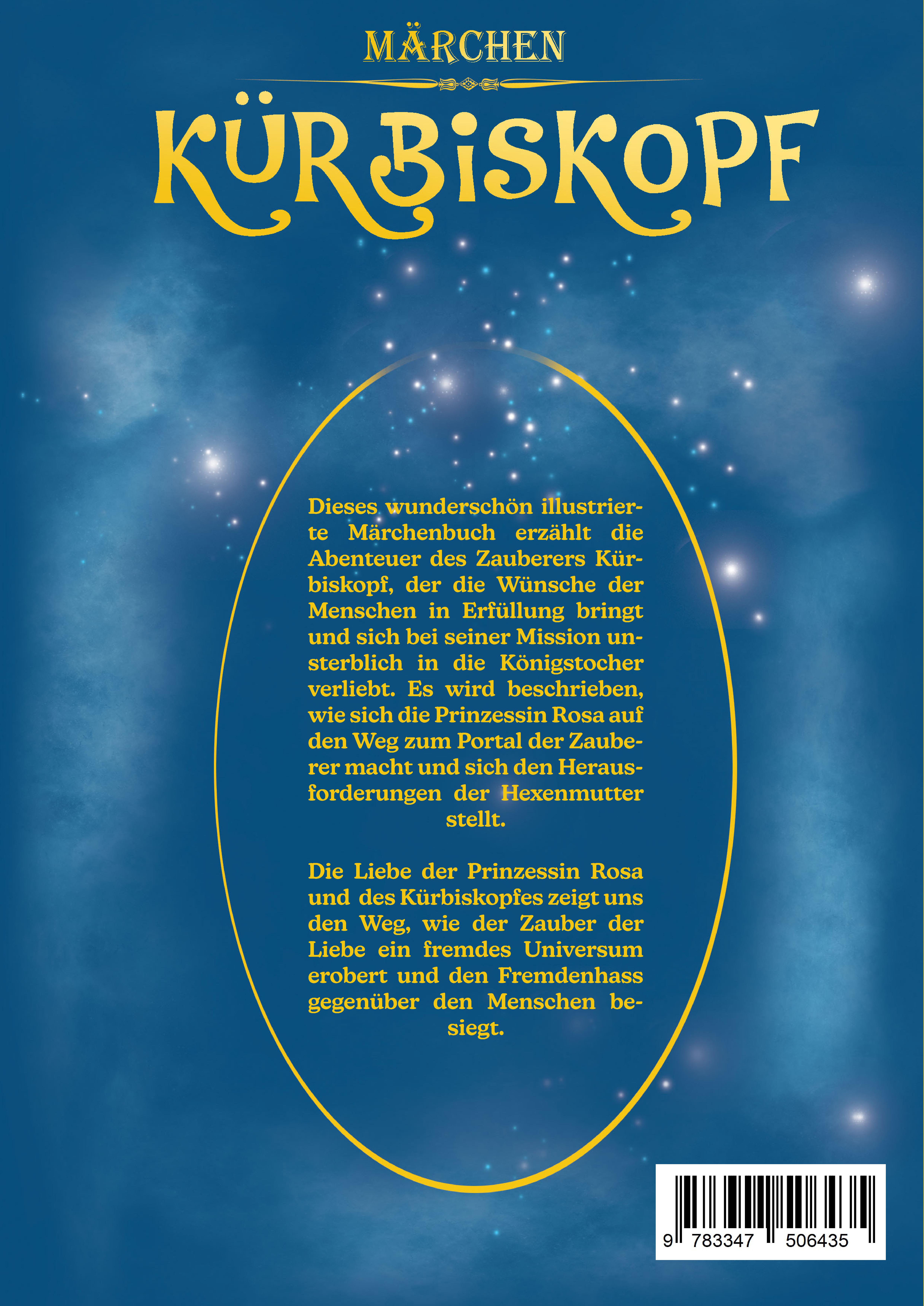 Dieses wunderschön illustrierte Märchenbuch erzählt die Abenteuer des Zauberers Kürbiskopf, der die Wünsche der Menschen in Erfüllung bringt und sich bei seiner Mission unsterblich in die Königstocher verliebt. Es wird beschrieben, wie sich die Prinzessin Rosa auf den Weg zum Portal der Zauberer macht und sich den Herausforderungen der Hexenmutter stellt.Die Liebe der Prinzessin Rosa und des Kürbiskopfes zeigt uns den Weg, wie der Zauber der Liebe ein fremdes Universum erobert und den Fremdenhass gegenüber den Menschen besiegt.