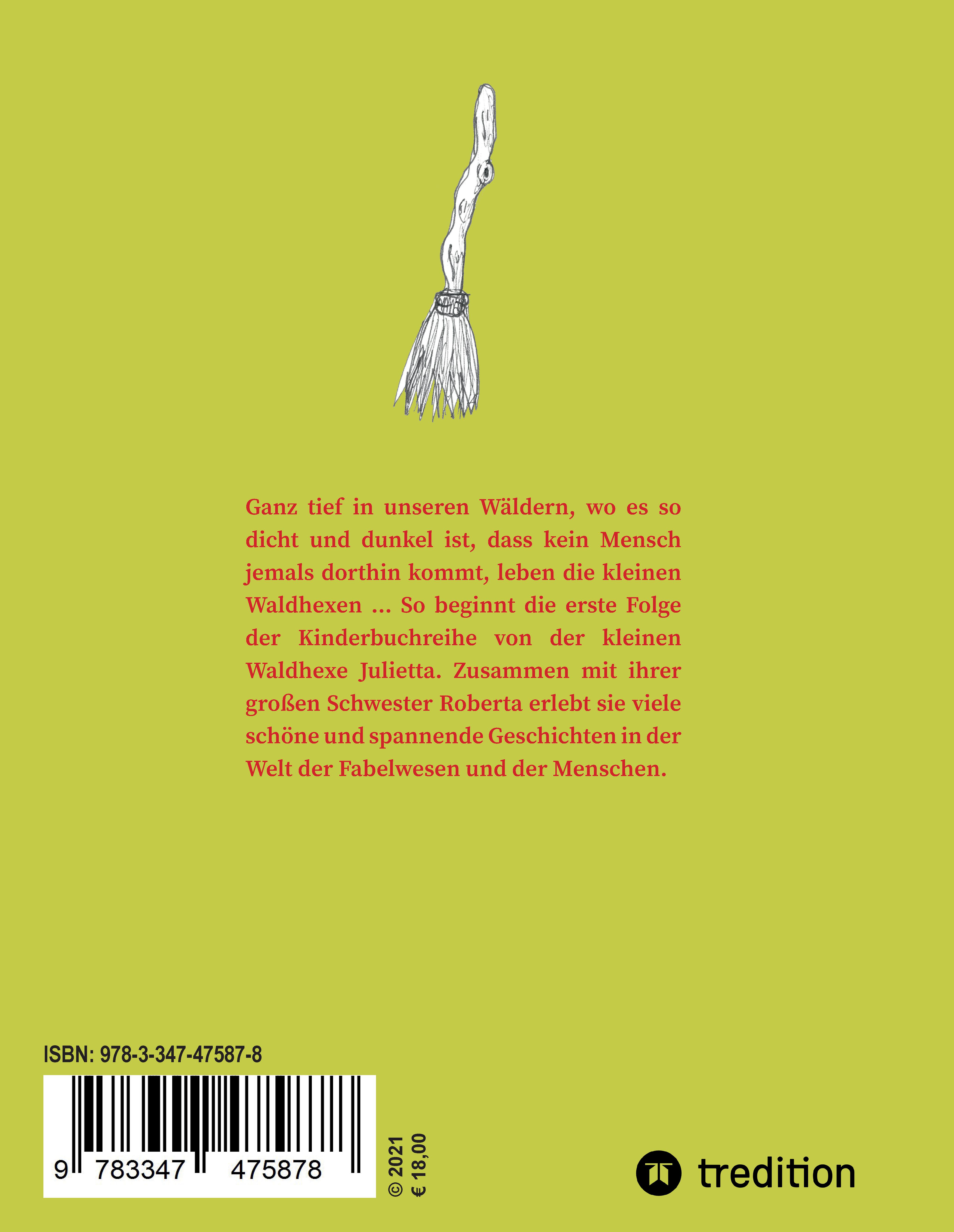 Ganz tief in unseren Wäldern, wo es so dicht und dunkel ist, dass kein Mensch jemals dorthin kommt, leben die kleinen Waldhexen ... So beginnt die erste Folge der Kinderbuchreihe von der kleinen Waldhexe Julietta. Zusammen mit ihrer großen Schwester Roberta erlebt sie viele schöne und spannende Geschichten in der Welt der Fabelwesen und der Menschen. Dabei trifft sie auf Zwerge, kleine braune Drachen mit rotem Kamm, bunte zierliche Elfen, einen riesigen Geier, große Drachen mit riesigen Krallentratzen und gefährlich aussehendem Maul, Eichhörnchen, Füchse, Rehe, Hasen und Waschbären und viele viele mehr. Mit dem Pony Max, dem bunten Papagei Hannibal, der Affendame Susi und dem alten Ziegenbock geht es im zweiten Band in die große Stadt. Und was dann auf dem Weg zum Blocksberg passiert, ist ebenso spannend wie das Johannisfest dort.