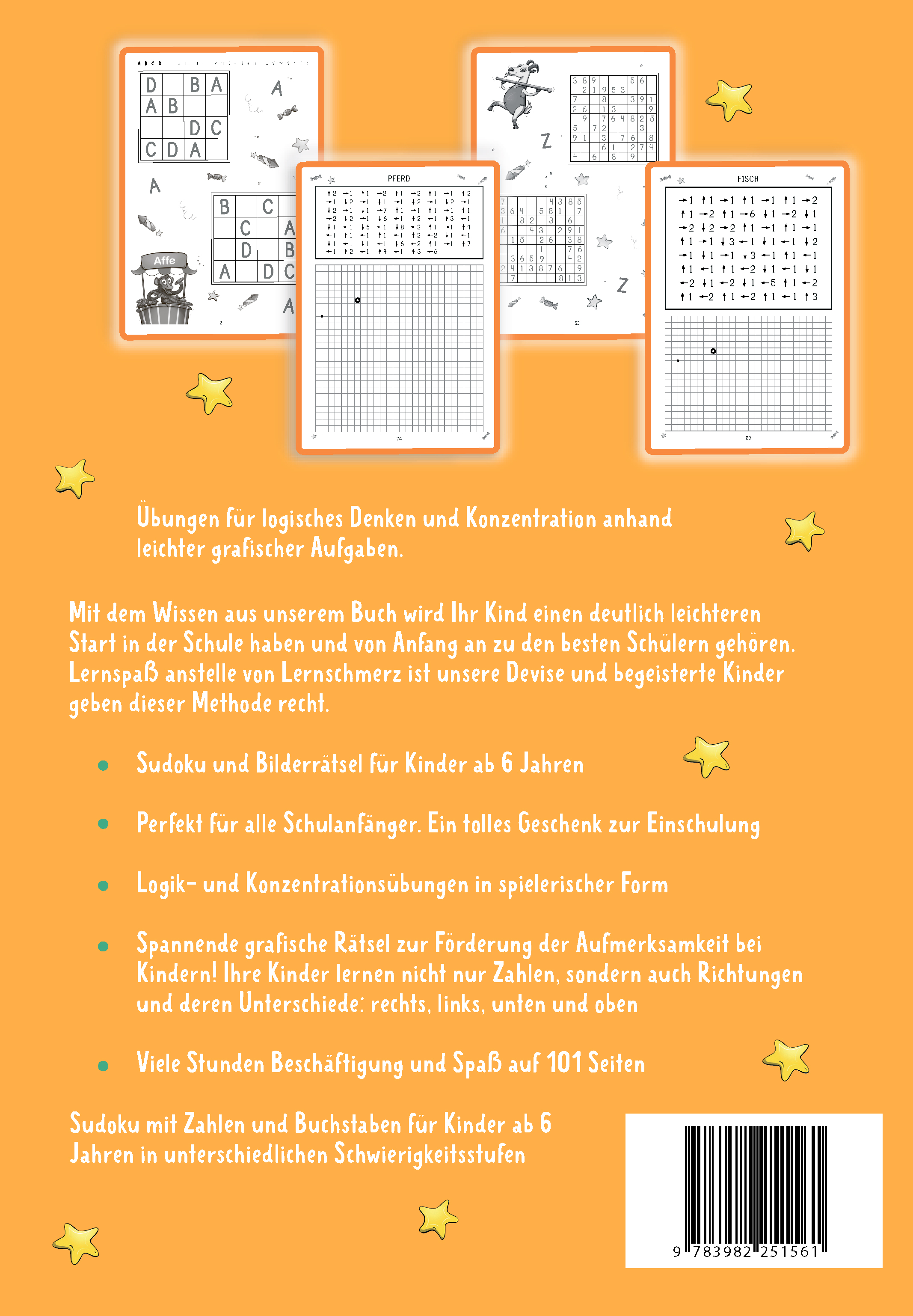 Das Buch „Konzentration: Effektive Übungen für Kinder“ wurde speziell für Kinder ab 6 Jahren entwickelt. Ziel des Buchs ist es, sie spielerisch und mit Leichtigkeit an konzentriertes und logisches Denken heranzuführen. Sie wollen, dass Ihr Kind spielend Buchstaben und Zahlen lernt? Dann ist dieses Buch genau richtig für Sie. Mit diesem Übungsbuch lernen Kinder leicht und altersgerecht Buchstaben und Zahlen. Sie lösen die Aufgaben im Sudoku Rätsel und vertiefen alle Buchstaben und Grundzahlen. Der zweite Teil des Buchs enthält Übungen, um die Aufmerksamkeit anhand von grafischen Rätseln zu trainieren. Das Kind übt spielerisch sein Zählvermögen und seine Konzentration.