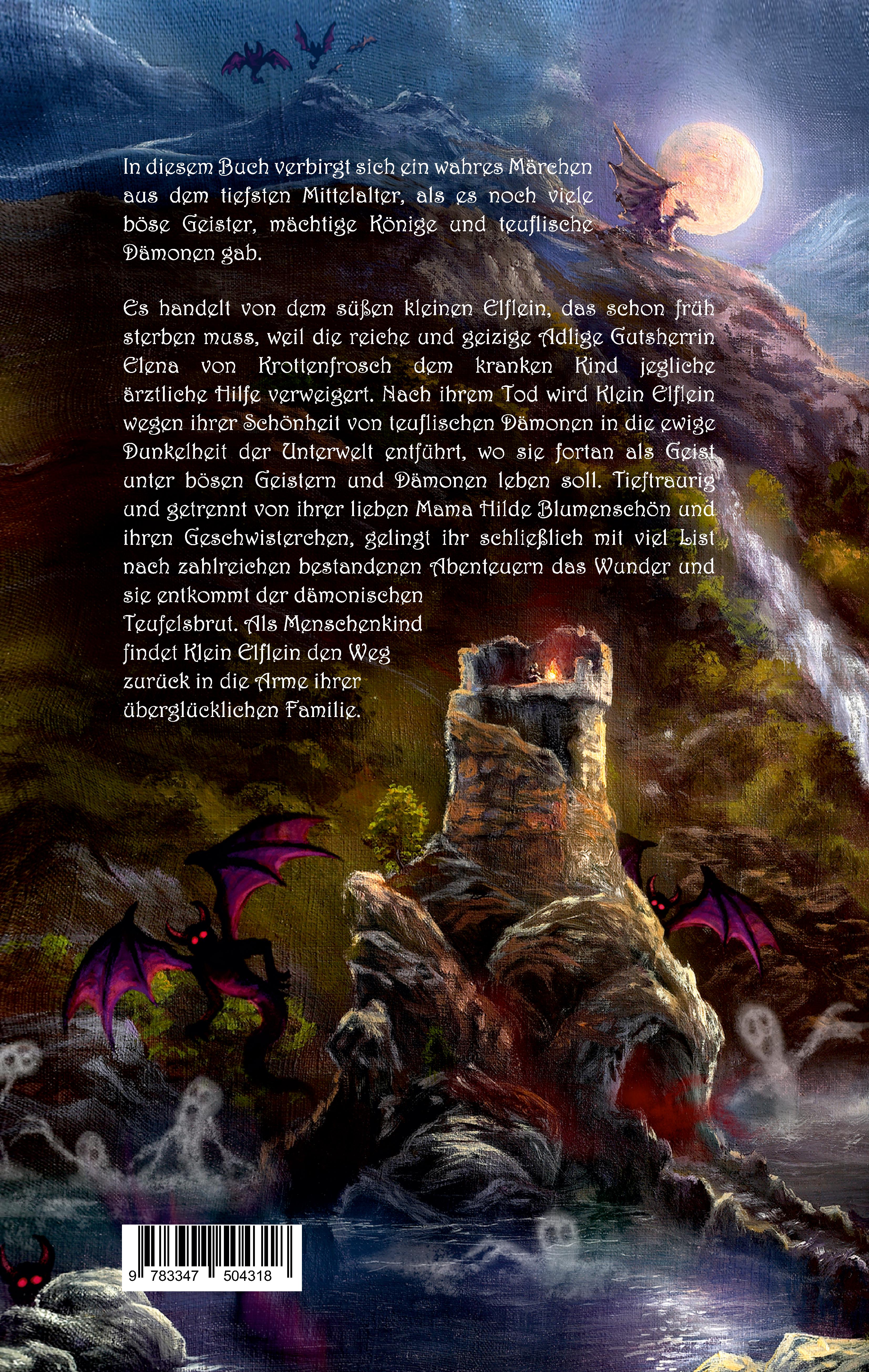 In diesem Buch verbirgt sich ein wahres Märchen aus dem tiefsten Mittelalter, als es noch viele böse Geister, mächtige Könige und teuflische Dämonen gab. Es handelt von dem süßen kleinen Elflein, das schon früh sterben muss, weil die reiche und geizige Adlige Gutsherrin Elena von Krottenfrosch dem kranken Kind jegliche ärztliche Hilfe verweigert. Nach ihrem Tod wird Klein Elflein wegen ihrer Schönheit von teuflischen Dämonen in die ewige Dunkelheit der Unterwelt entführt, wo sie fortan als Geist unter bösen Geistern und Dämonen leben soll. Tieftraurig und getrennt von ihrer lieben Mama Hilde Blumenschön und ihren Geschwisterchen, gelingt ihr schließlich mit viel List nach zahlreichen bestandenen Abenteuern das Wunder und sie entkommt der dämonischen Teufelsbrut. Als Menschenkind findet Klein Elflein den Weg zurück in die Arme ihrer überglücklichen Familie.